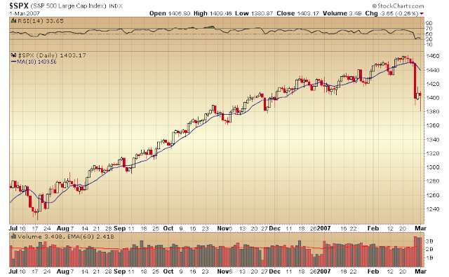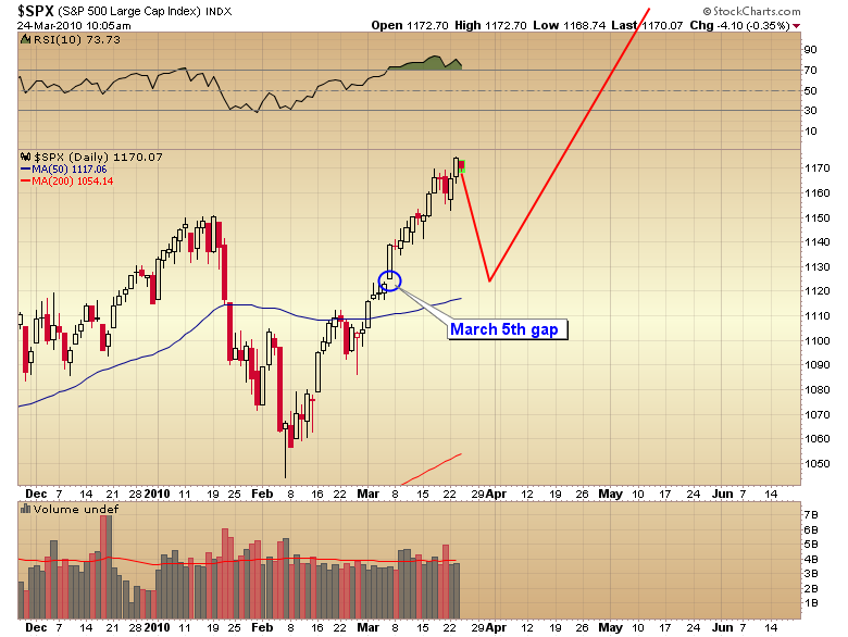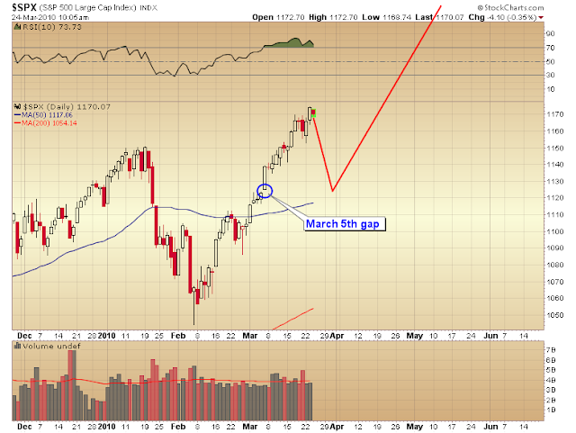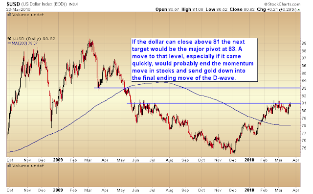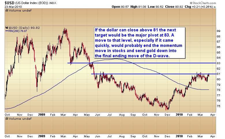 I expect the markets to hang in reasonably well during the impending correction, possibly filling the March 5th gap. Once the dollar begins the trip down we should see an explosive move in stocks and commodities, possibly the final surge higher in this third leg of the cyclical bull market.