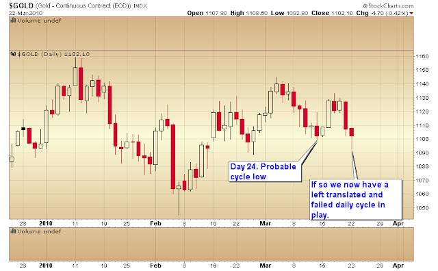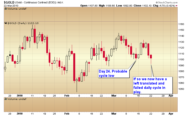 I’m expecting the correction in stocks will also correspond to the final leg down in what now looks to be a D-wave decline in gold that will most likely test the $1000-$1025 level. The left translated character of the current daily cycle is also confirming this.