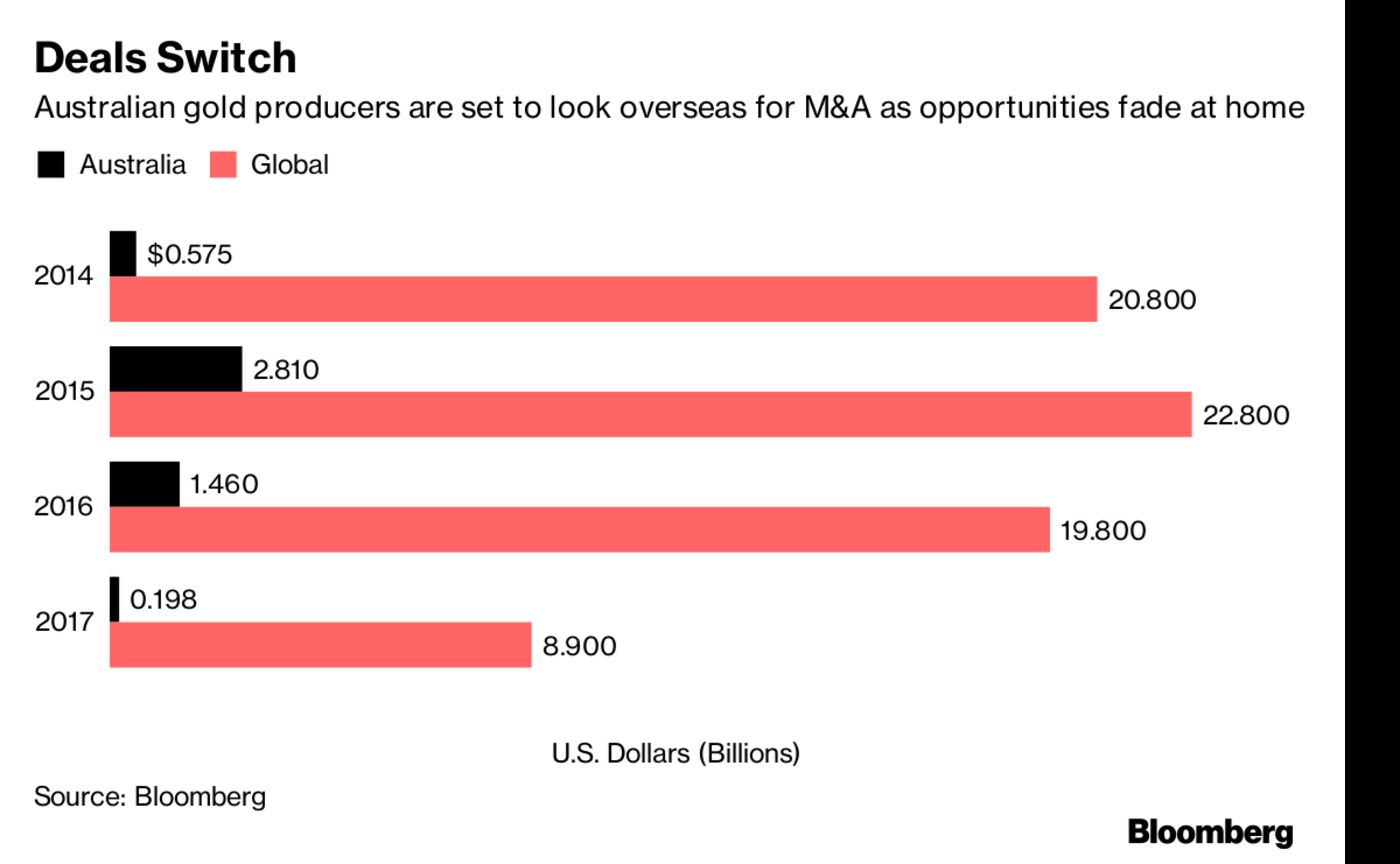 Gold companies based in Australia have proposed or completed acquisitions worth about $4.5 billion since a rebound in deal-making in 2015, though the value of deals so far this year has slowed to just $198 million, according to data complied by Bloomberg. There’s a lack of quality targets and producers have chosen to use cash to fund internal growth options, according to Argonaut Securities Ltd.