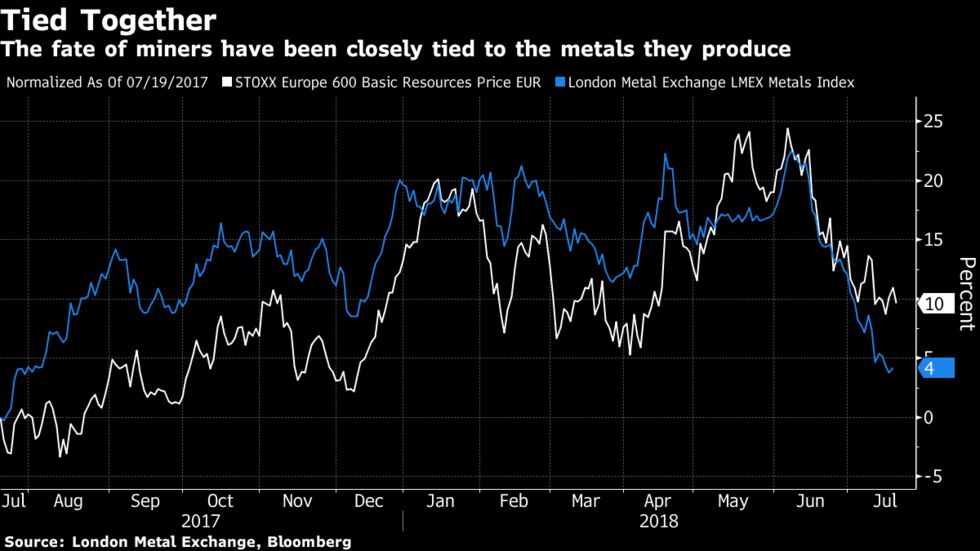 That miners are heavily exposed to metal prices is predictable, but the dependence is growing. A 10 percent move in the LMEX Index of six base metals corresponded to a 7 percent move in the Stoxx Europe 600 Basic Resources sub-index in the past year -- that’s stronger than during the preceding decade, according to data compiled by Bloomberg.