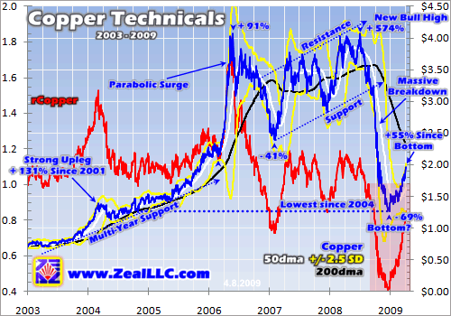 After achieving a new high in Q3 2008 copper then knifed through support and took a nosedive to its December low of $1.27, a price not seen since 2004. Copper’s rapid decline shattered the support of every technical model conceivable. And as you can see by the red shaded area it has spent the last 7+ months trading underneath its 200dma. With prices typically outpacing their 200dmas in bull markets, this subpar (relativity lower than 1.0) season is certainly testing the integrity of copper’s bull.
