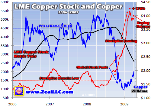 From October 2008 LME copper stockpiles rose by a staggering 176% before finally leveling out in February. Other than a couple of flat interday moves, LME stockpiles grew every day for nearly 4 months. Nobody was taking delivery on the king of the base metals.