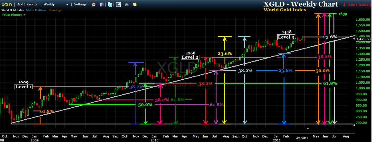 Each Fibonacci measurement uses the base price of $681 which was the price of gold when this up leg began in October 2008.