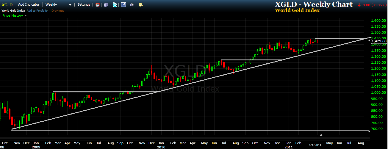 We will begin with a simple weekly chart of the World Gold Index (XGLD) and employ a diagonal support trend line and three horizontal lines identifying price breakout levels. No doubt you will notice that price movement has been subdivided into three completed stages, each separated by a new break higher through a horizontal resistance line. And, current price is contemplating a move higher that would take it into a fourth stage of the up leg.