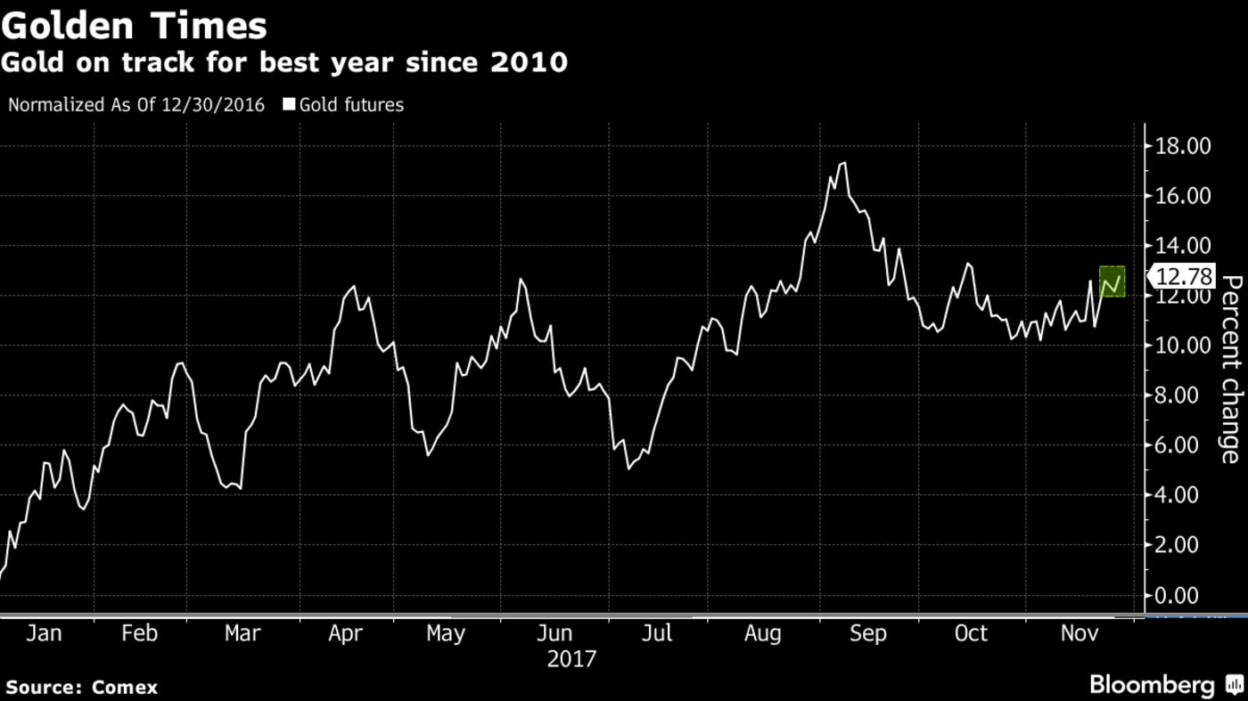 Gold prices should continue to head higher, averaging $1,300 in 2018, BMI Research said in a report. Futures have averaged about $1,260 this year.