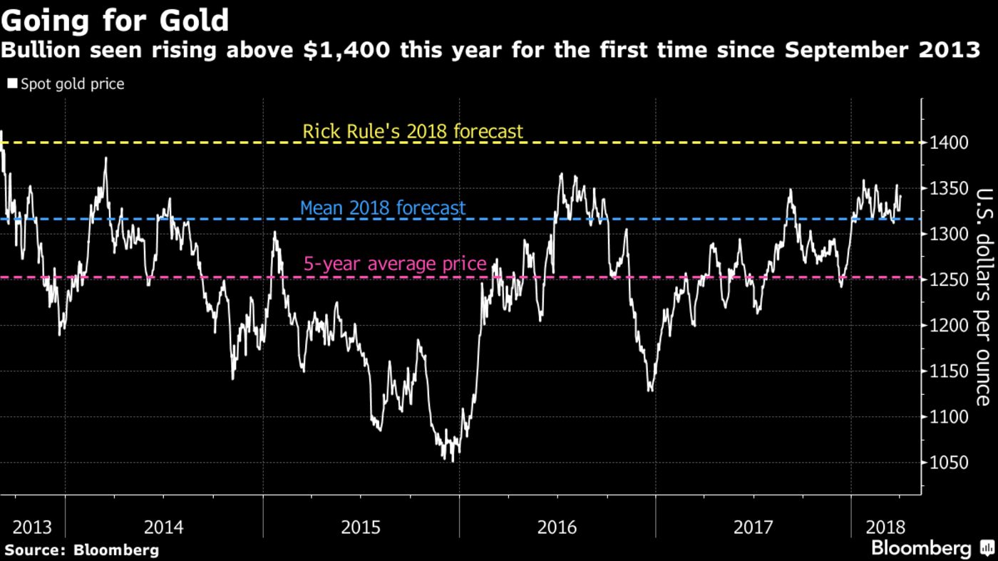 Bullion could top $1,400 an ounce in 2018 as escalating trade tensions drive investors to havens and the three-decade bull market in bonds nears an end, said Rule, who’s due to speak at a conference in Hong Kong on Wednesday. Spot gold traded at $1,337.50 Tuesday after three straight quarters of gains, while exchange-traded fund holdings are around the highest in half a decade.