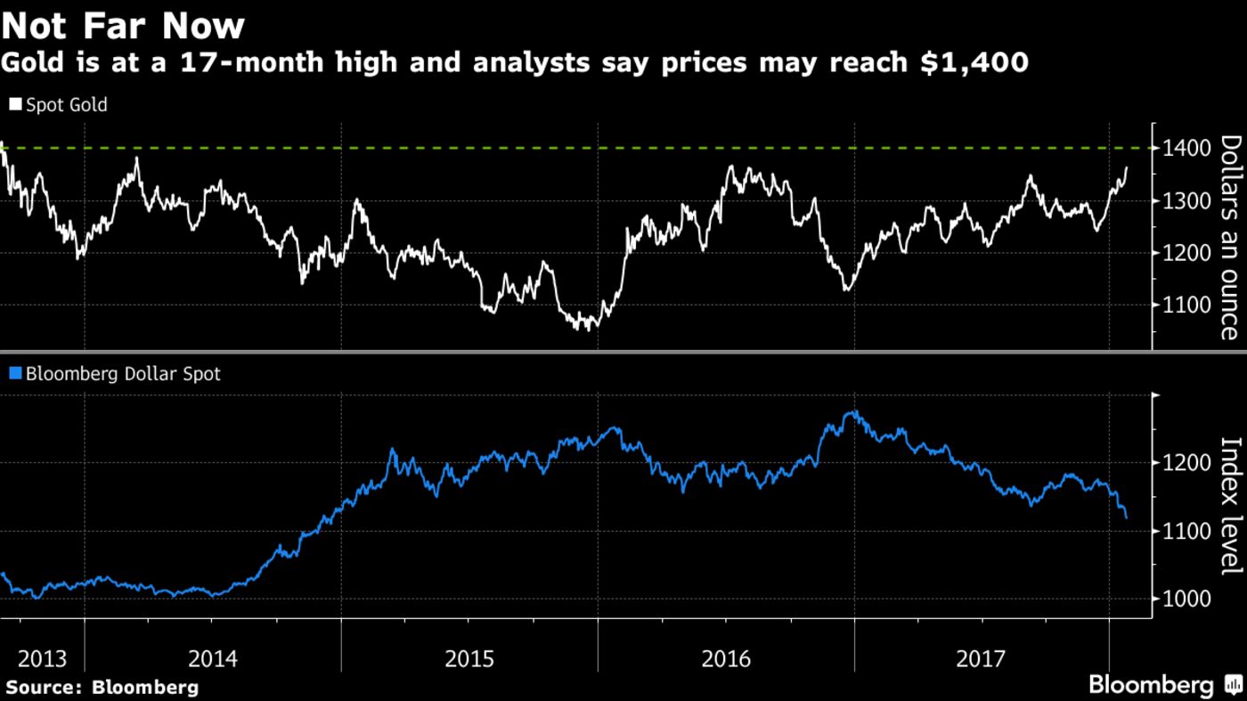 Bullion at $1,400 an ounce is “achievable” in the next two months, Stephen Innes, head of trading for Asia Pacific at brokerage Oanda Corp., said in an interview Thursday. The Bloomberg Dollar Spot Index plunged to the lowest since 2014 after Treasury Secretary Steven Mnuchin endorsed the currency’s drop at the World Economic Forum in Davos.