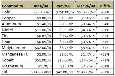 The effects (perception) of the proposed infrastructure replacement and build-out are beginning to stabilize world equity markets and banking systems. This will not impede the investment in gold/silver and precious metals as the underlying strength in these commodities is based on the weakening confidence in paper money. How will this effect base and specialty metals? Not only will demand outstrip supply resulting in stronger base metal prices but it will also eventually become a hedge against paper currencies, which will only help accelerate the recovery in the base and specialty metal companies around the world. See the following comparison of some of the commodity price losses in the past 10 months.