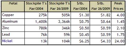 Lead has begun to flat line with nickel continuing to increase since they began to rise in November 2008 and June 2008. Aluminum is the only exception with stockpiles rising 164,000 tonnes since March 1, 2009. Stockpiles of aluminum have been rising steadily since February 2007.