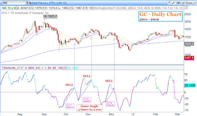 You know, I have been drawing these darned trend line breaks on the TSI for years and years.... and I got to looking at a few of these on GC and wondered to myself if they were the exact same angle. Then I remembered I had a way to find out the answer to my own question.