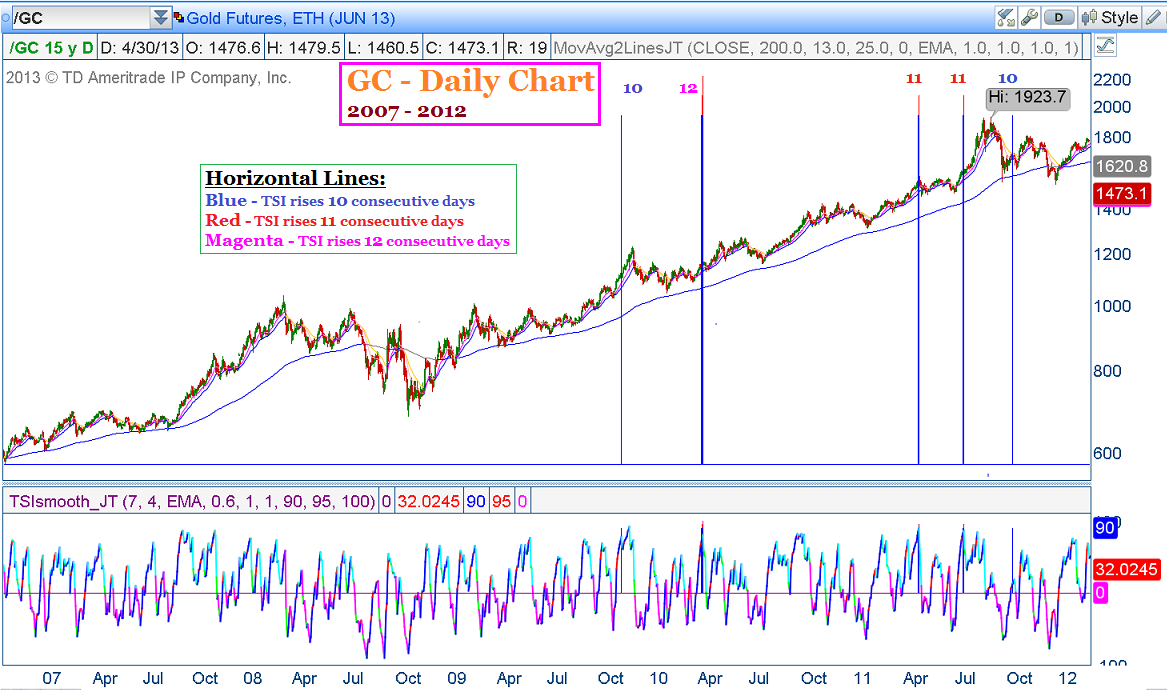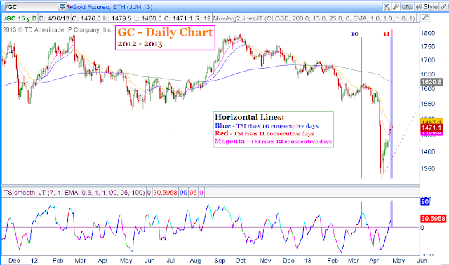 Getting down to the specifics of gold's price action today, I created another (simple) indicator to locate for me all the times that the TSI (7,4) was positive 10, 11 and 12 days in a row.