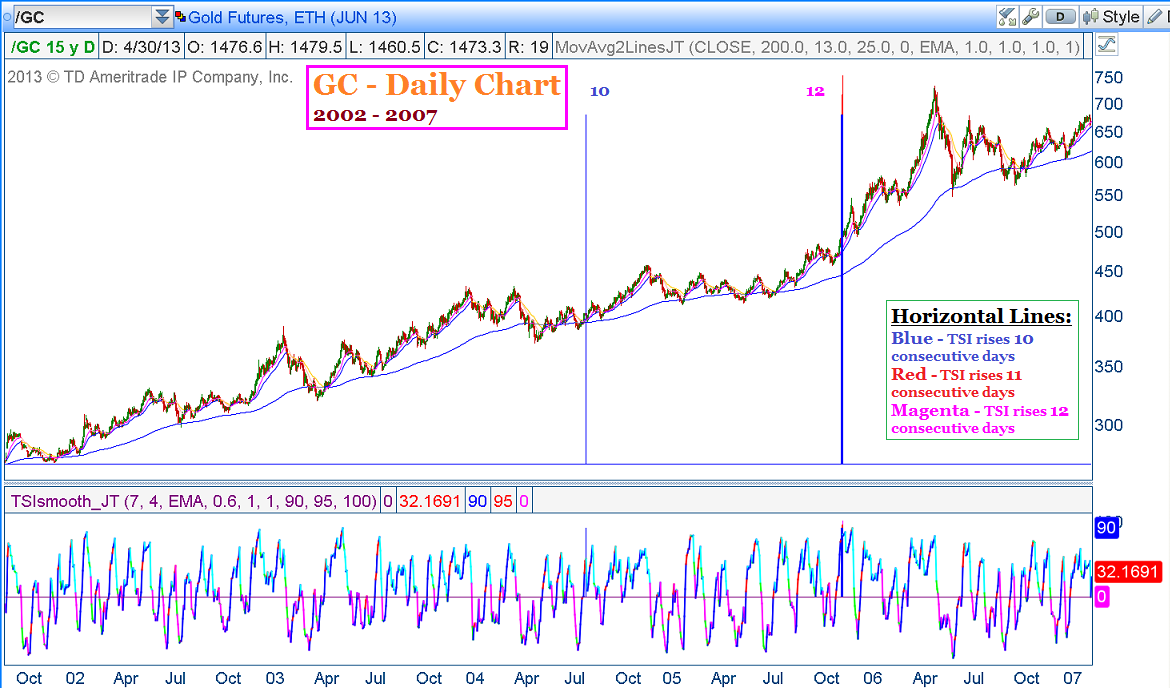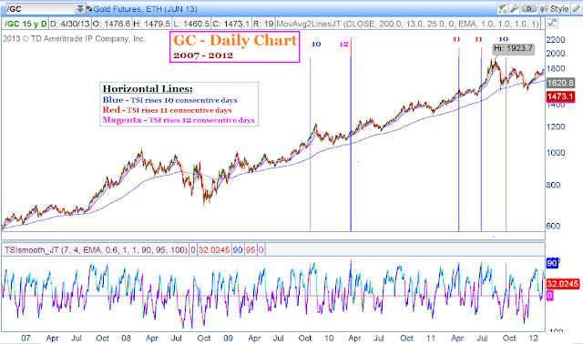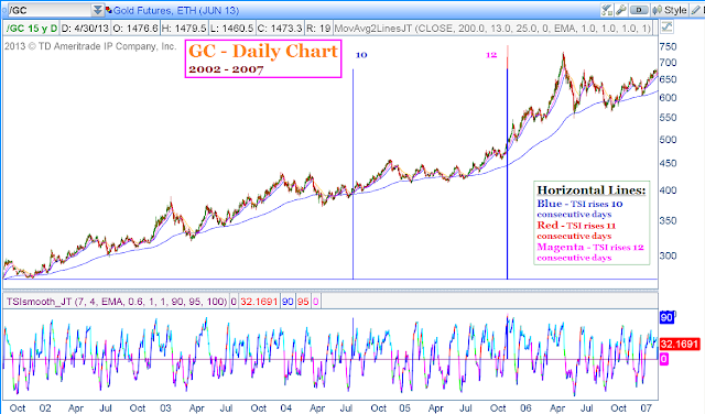 As of today, and providing /GC closes somewhere around $1470 or better, it is the 11th consecutive day in a row that the TSI indicator has risen. I thought this might be unusual, and it is. Let's see when it has happened in the past beginning with 2001 - 2007.