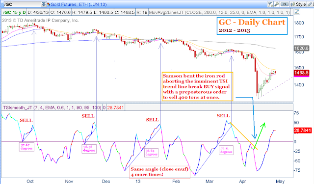 Then an order to sell 400 tons of paper gold hit the market. Price plummeted. The TSI plummeted. There would be no bullish trend line break BUY signal that day.
