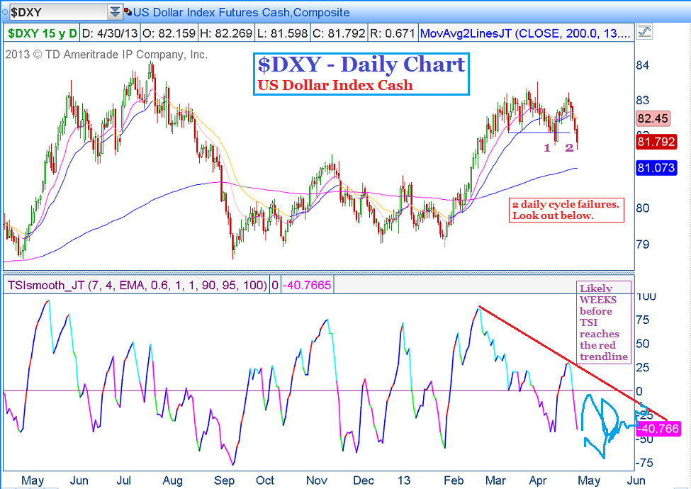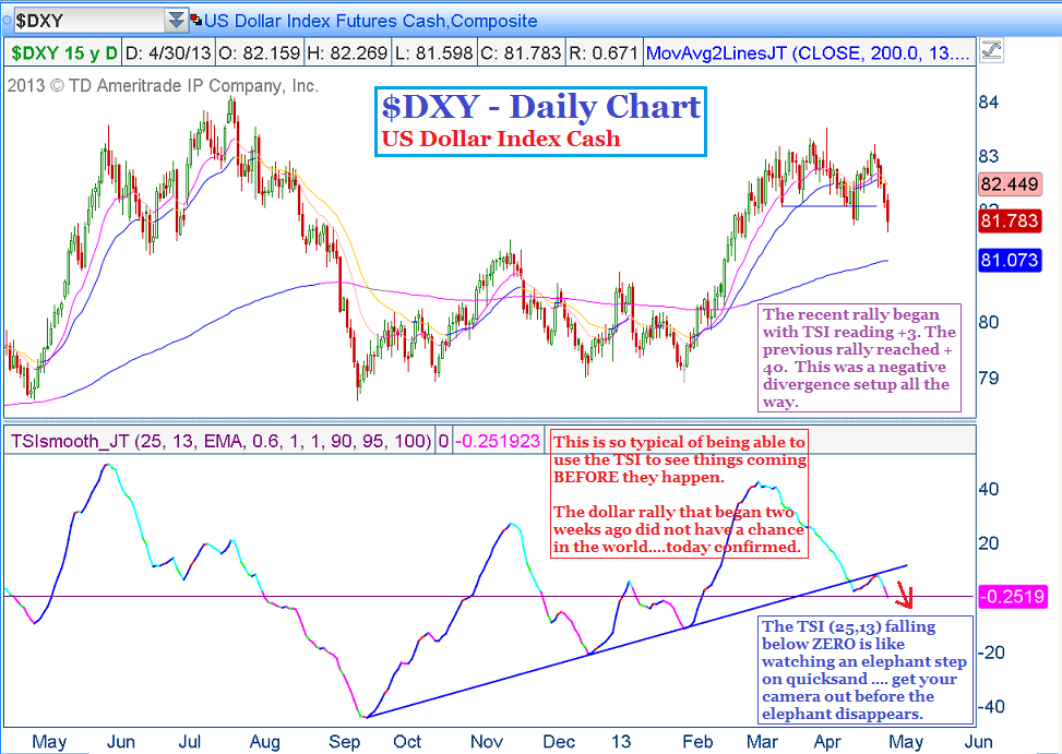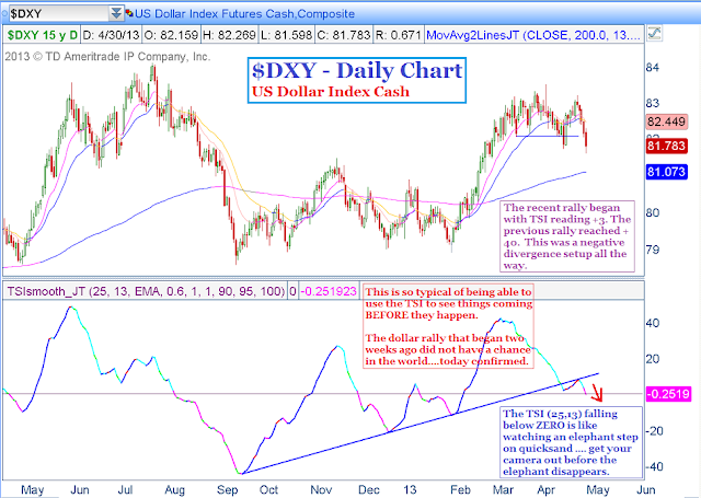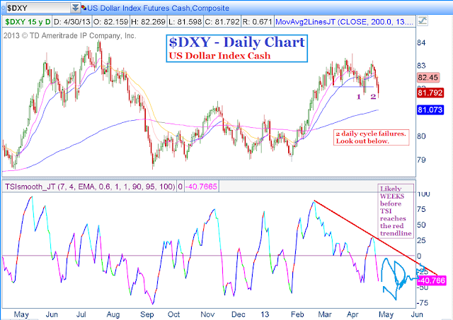 On Wednesday April 17th I penned this article proclaiming US Dollar Index - Good Odds for a Meltdown and used the /DX daily chart with TSI (25,13). What I really didn't explain adequately (my apology) was more about why a likely subsequent rally in the dollar (which we have briefly had since that post two weeks ago) had high odds for failure.