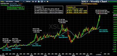 For this study I have chosen to examine the relative degree to which silver price can exceed its underlying 200 day moving average.  This weekly chart of the World Silver Index (XSLV) uses the 40 week moving average as a proxy for the 200 day moving average.