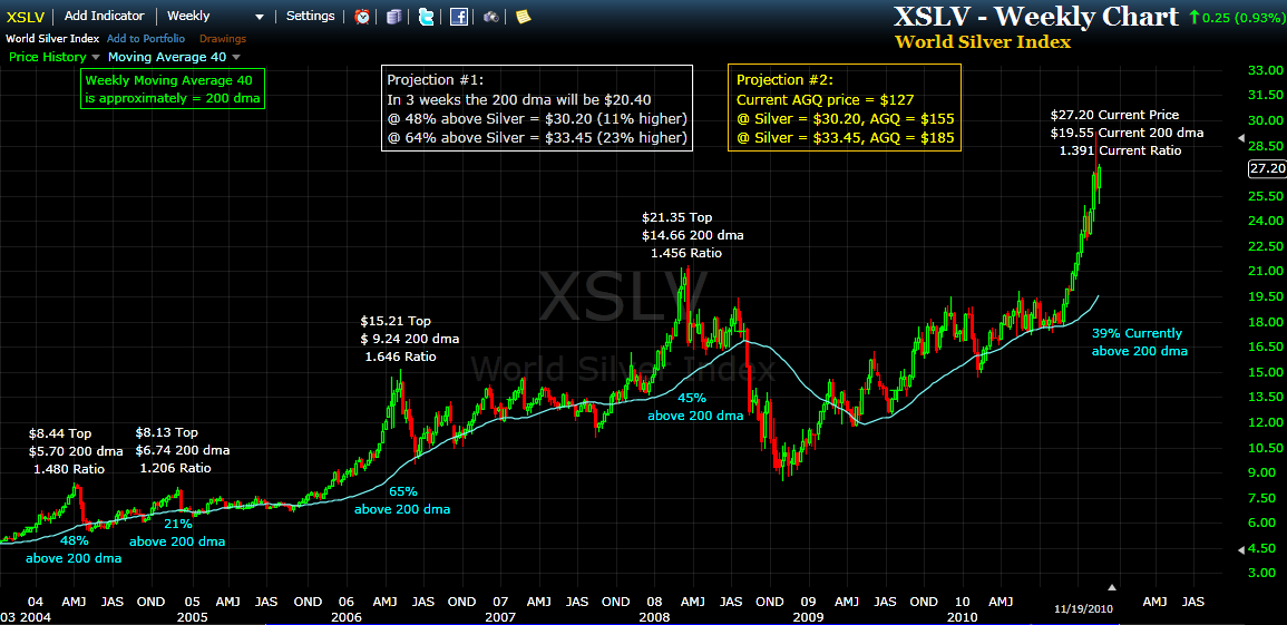 For this study I have chosen to examine the relative degree to which silver price can exceed its underlying 200 day moving average.  This weekly chart of the World Silver Index (XSLV) uses the 40 week moving average as a proxy for the 200 day moving average.