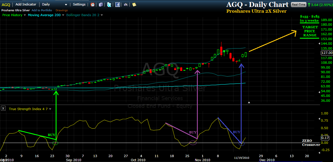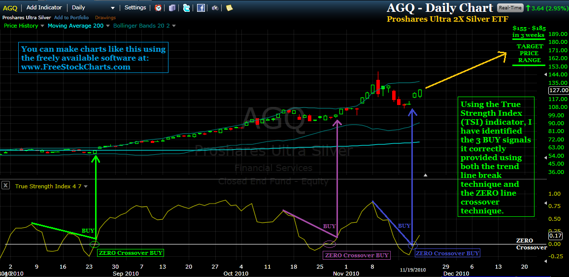 Here I offer a simple chart of Proshares Ultra 2X Silver (AGQ) with my likely modest forecast applied to the chart.  I have arbitrarily chosen to guesstimate that this move will last approximately 3 weeks past today.