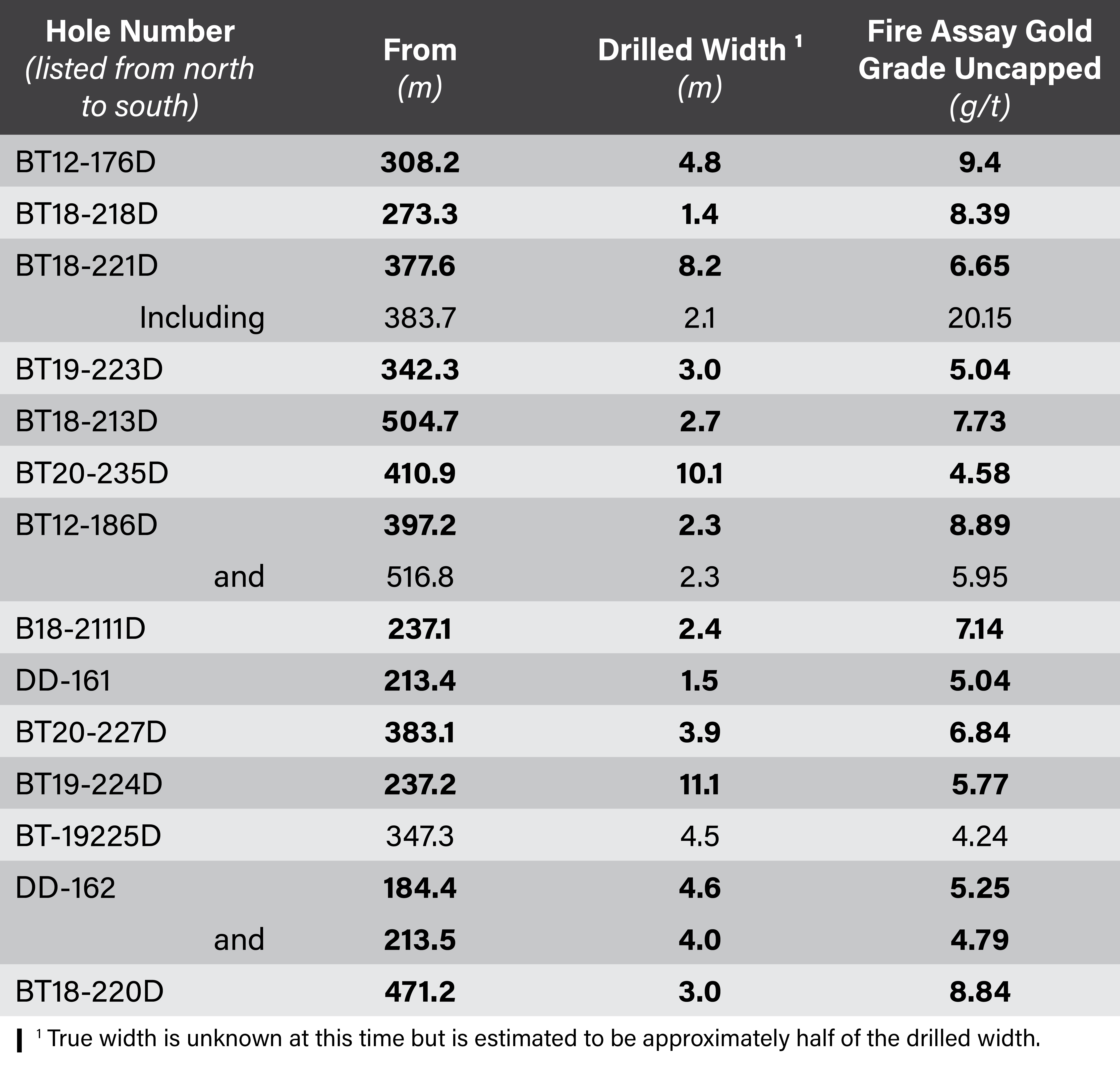 The table below lists those and other intercepts utilized in the delineation of the high-grade core which extends to approximately 500 meters below surface and remains open at-depth with possible extensions along 5 kilometers of strike length: