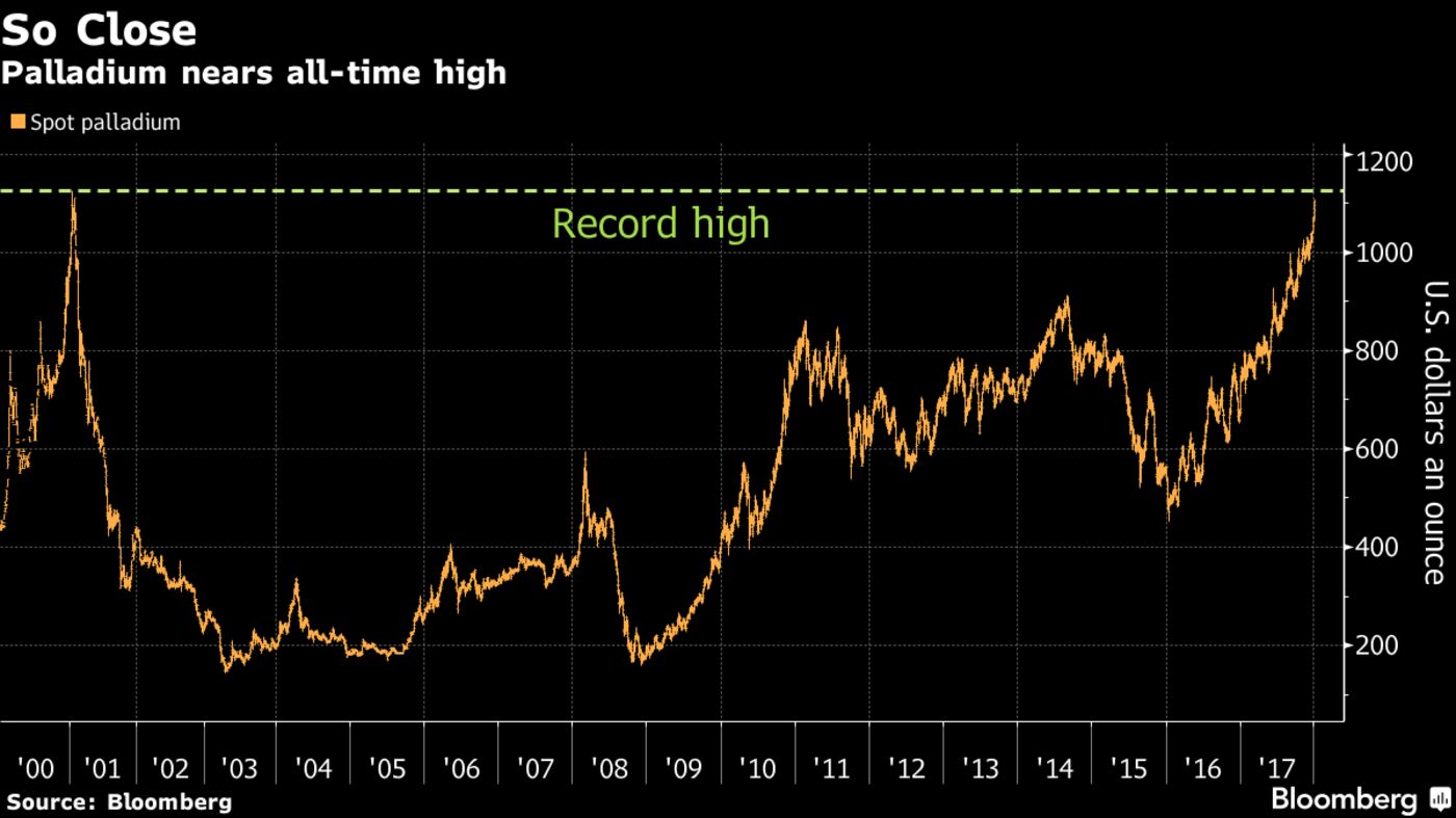 New York futures for the metal, used to cut car exhaust fumes, already touched the highest for a most-active contract in records going back to 1986.