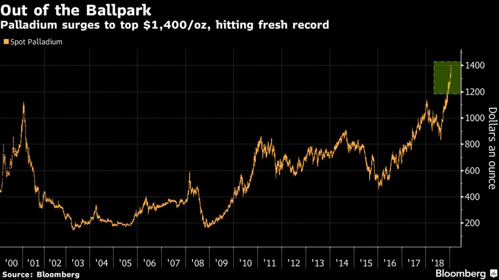 Palladium rose as much as 5.4 percent to $1,439.29 an ounce. It traded at $1,394.97 by 1:39 p.m. in New York. At the Comex exchange, palladium for March delivery climbed 2.3 percent.
