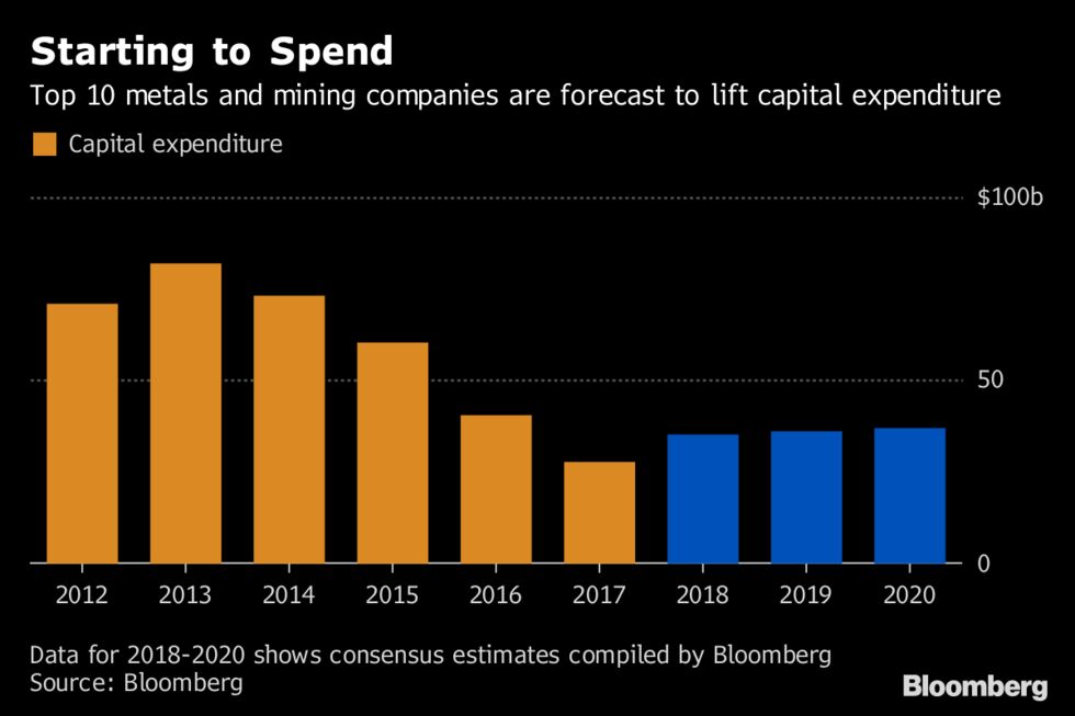 Capital expenditure among the 10 largest metals and mining companies is forecast to advance to about $35 billion this year, the first annual rise since 2013, according to data compiled by Bloomberg.