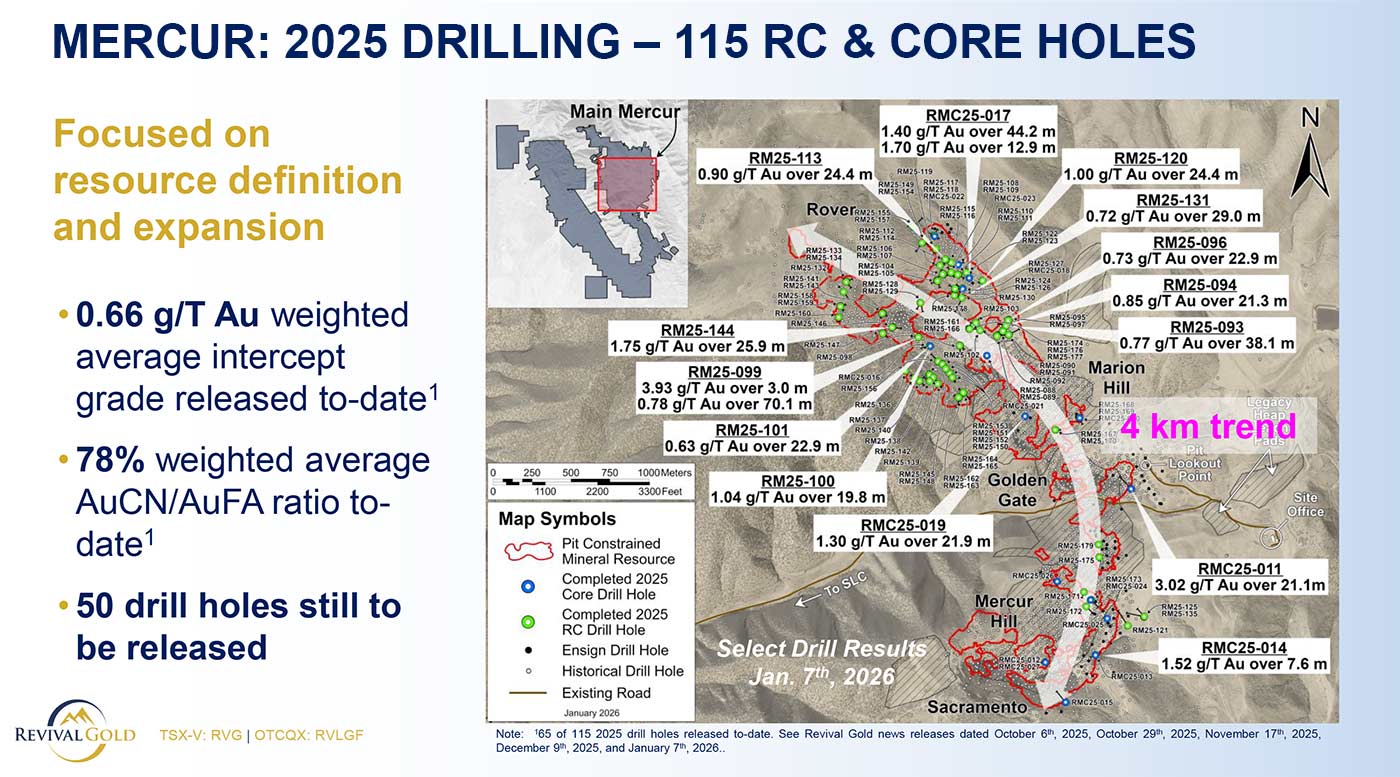 As part of that push toward production, Revival completed a 115-hole RC and core drilling program across 4 km of trend at Mercur to infill resources, test mineralized extensions, and collect metallurgical samples.