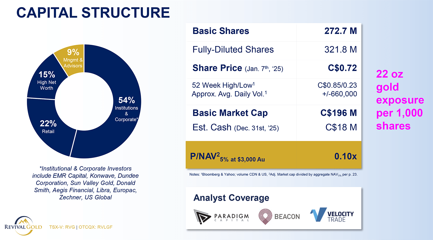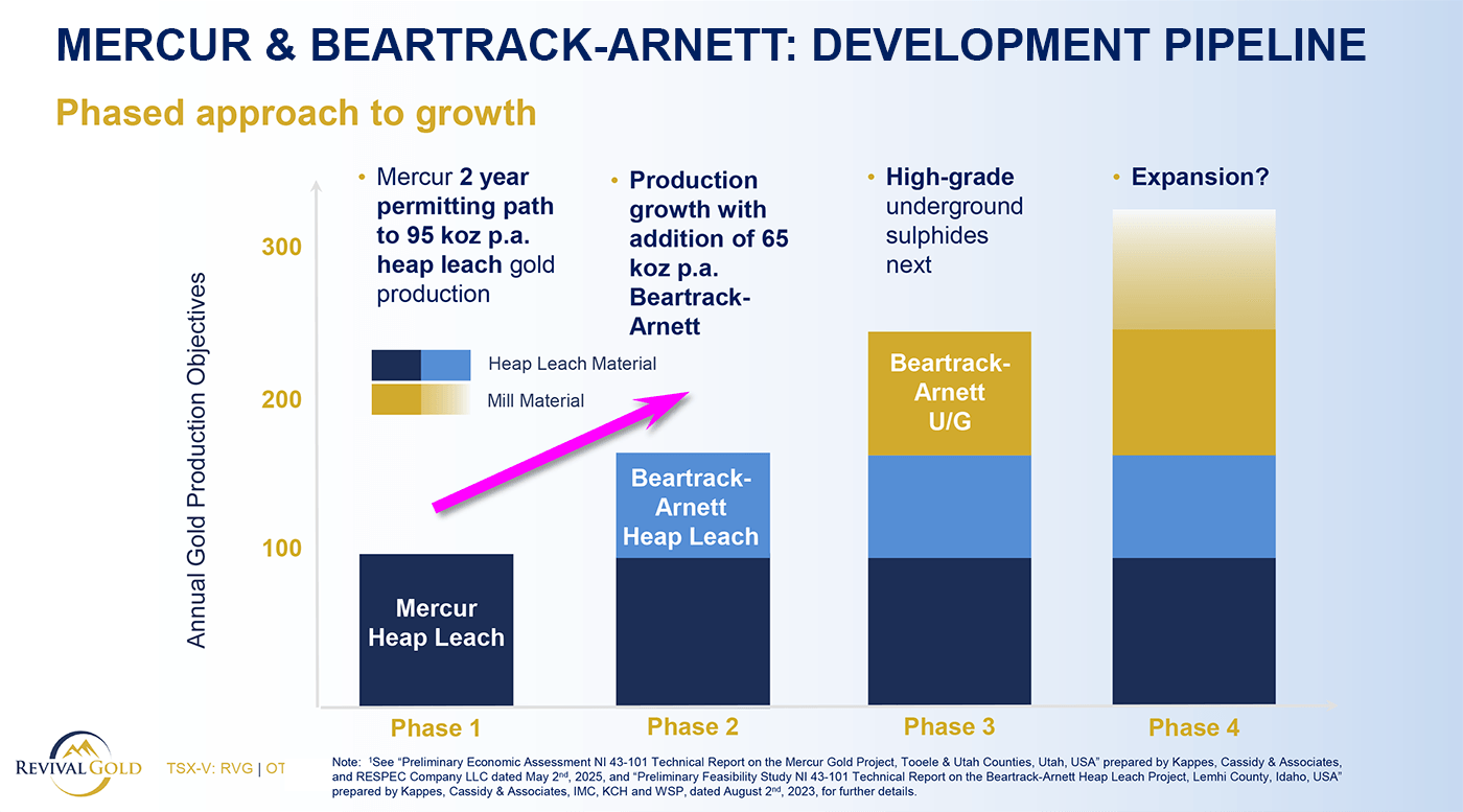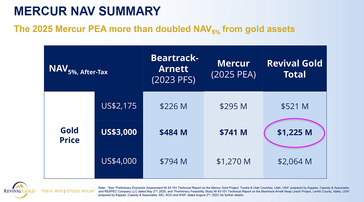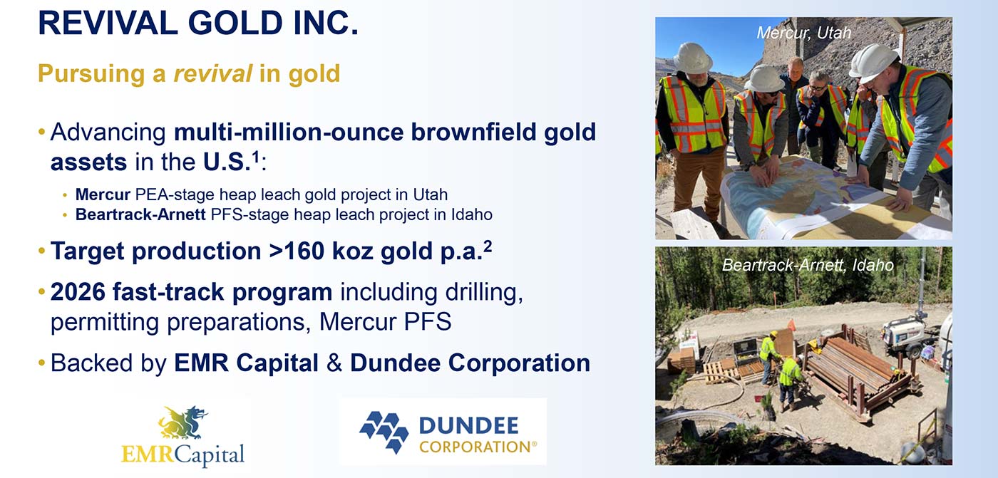 At the project level, the valuation leverage is already clear: between Mercur and Beartrack-Arnett, Revival holds millions of gold ounces advancing through engineering and economic studies toward first production.