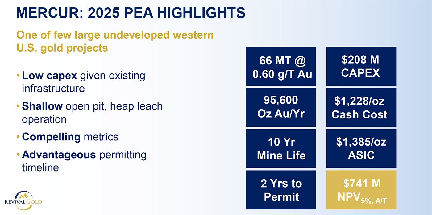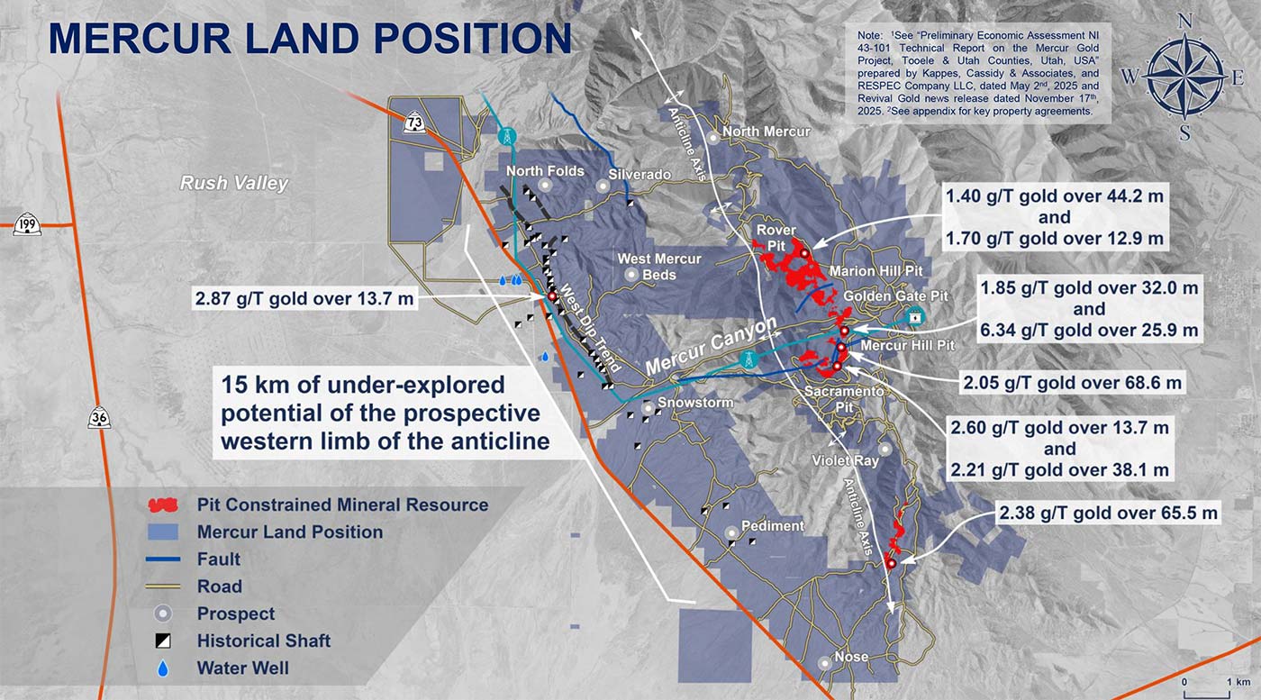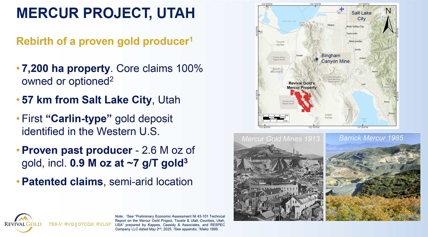“Barrick produced 1.4 million ounces of gold at Mercur but never controlled the contiguous Homestake claims and west Mercur land position. This option exercise completes the consolidation of a large Carlin-style gold system — a rarity outside the Nevada gold majors — and comes with paved road access, an energized powerline to the site, and extensive technical information. Mercur is our top priority to move to production. Utah is a favorable jurisdiction, and we expect a relatively short timeline to re-permit Mercur for mining. Mercur’s PEA economics have the potential to drive transformational value for Revival Gold’s shareholders. Barrick has operated to high standards of environmental and community stewardship at Mercur, and Revival Gold is committed to upholding the same high standards.”