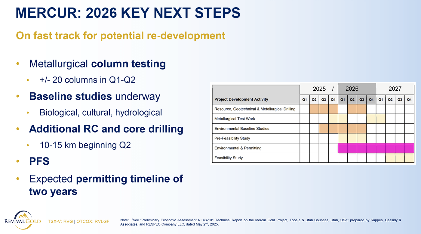 “Revival Gold is thrilled to welcome Tim Barnett as General Manager at Mercur and pleased to kick off 2026 with further encouraging assay results and development news at Mercur. Our primary operational objective is to restart gold production at Mercur. And with today’s news, we are adding to our leadership team and ramping up activity in support of that objective. With the gold price comfortably above US$4,000 per ounce, bringing a new 100,000 ounce per annum domestic gold mine into production will create significant value for our owners.”
