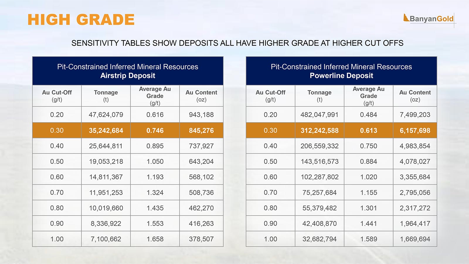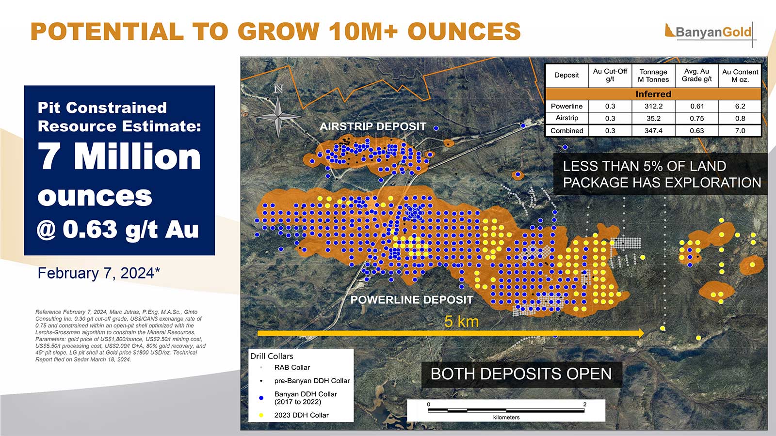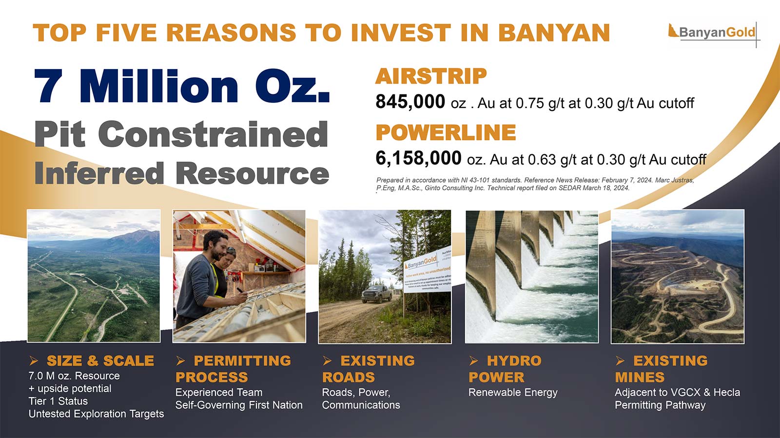 On 7 February 2024, Banyan Gold issued an updated MRE (Mineral Resource Estimate) for the Powerline and Airstrip deposits, delineating 7.0 Moz Au combined in an NI 43-101-compliant, pit constrained, open-pittable Inferred resource across 5 km of strike length.