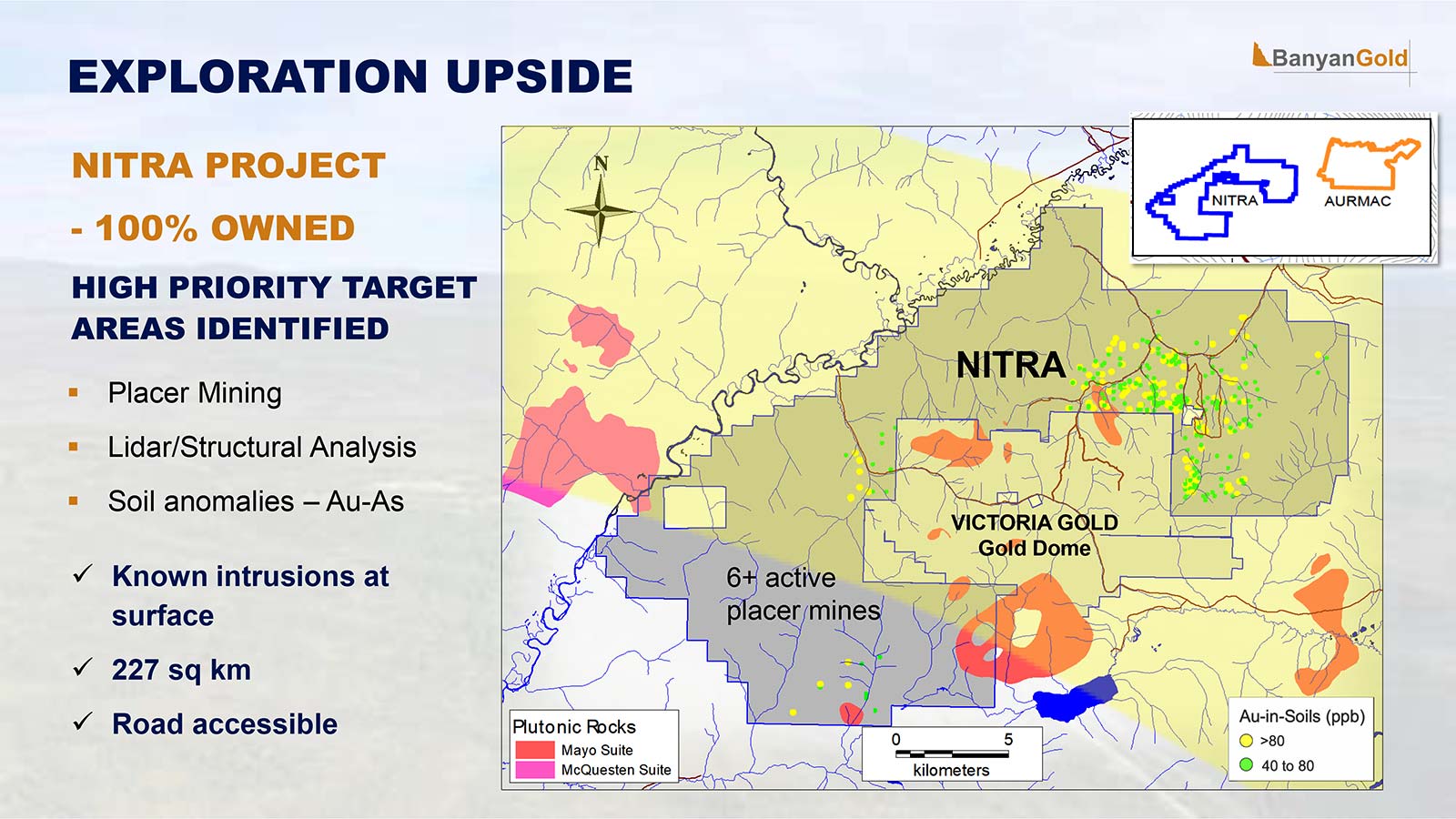 The 100%-owned Nitra property comprises 593 claims spanning 117 sq km and has known intrusions at surface. The Banyan team believes, based on prospecting, that the Nitra property exhibits similar geological potential to AurMac.