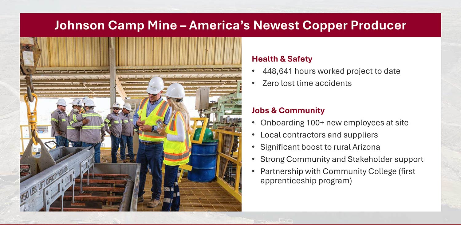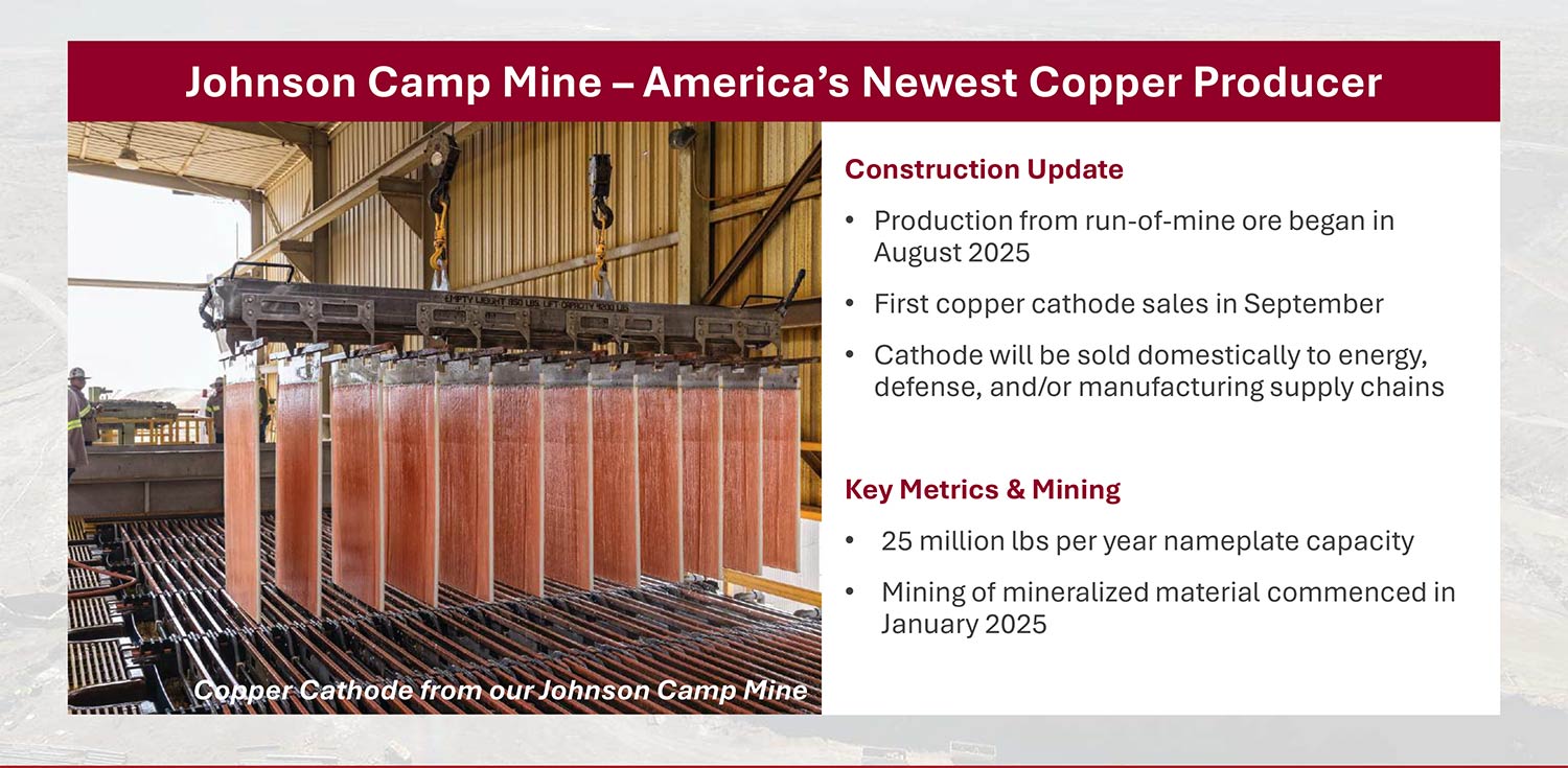 Production from Johnson Camp is underway — with a nameplate capacity of 25 million pounds annually — with every pound mined and processed within the United States.