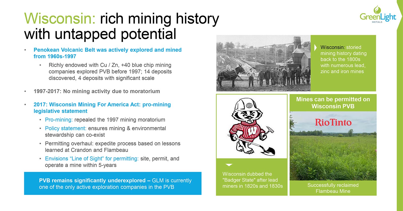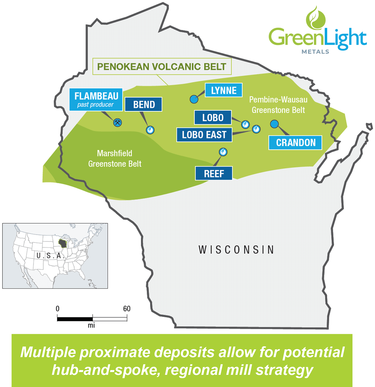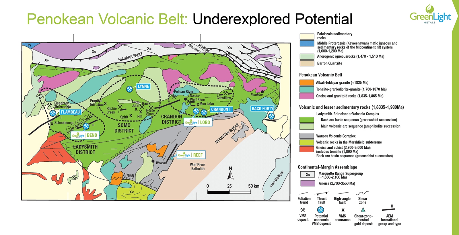 GreenLight Metals (“GRL”), with a sub-C$50 million market cap, controls two of the most prospective polymetallic exploration assets in Wisconsin’s Penokean Volcanic Belt: Bend and Reef.