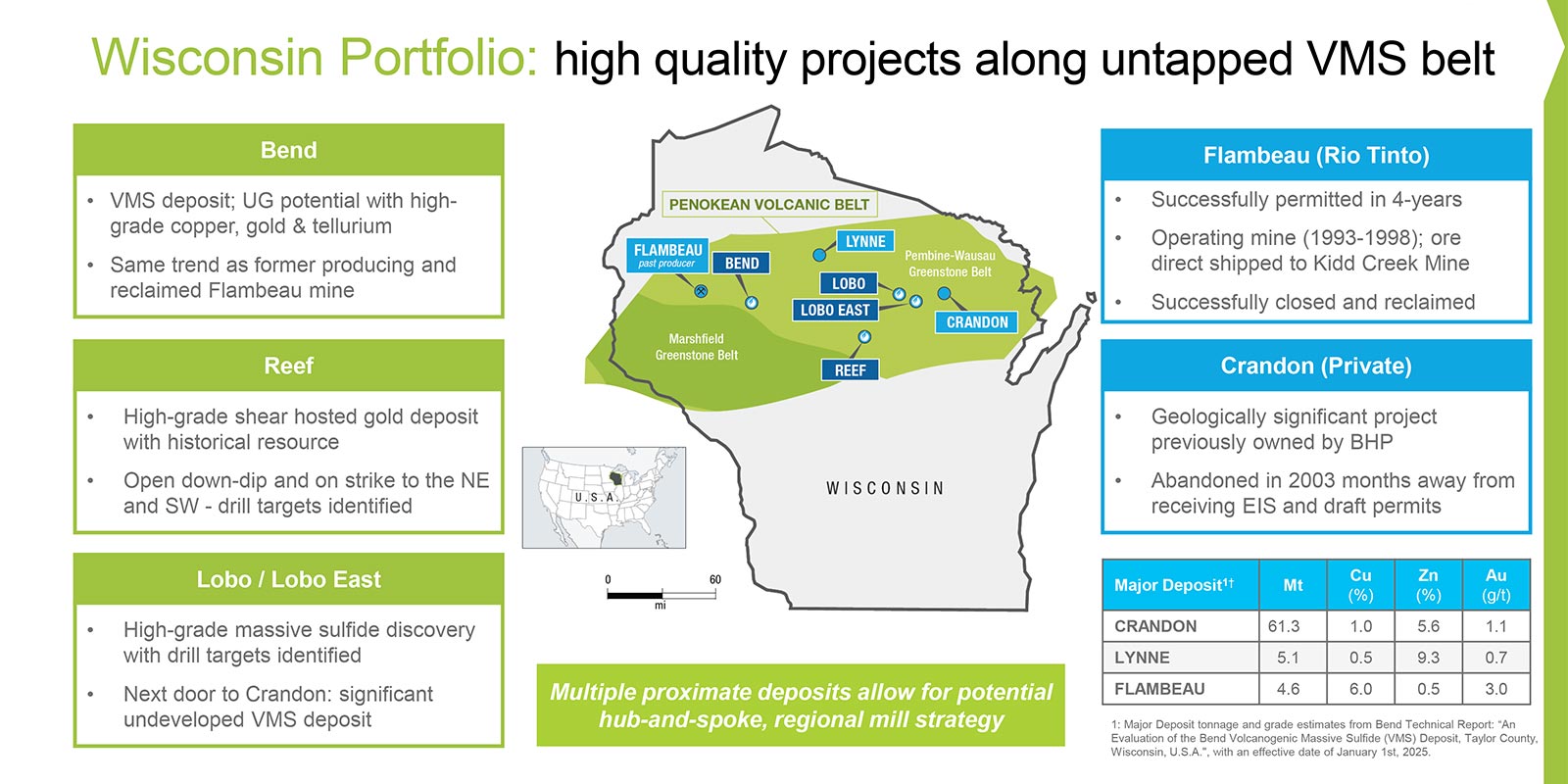 - Strategically situated within northern Wisconsin’s Penokean Volcanic Belt (~35 miles from the past-producing Flambeau Mine).
