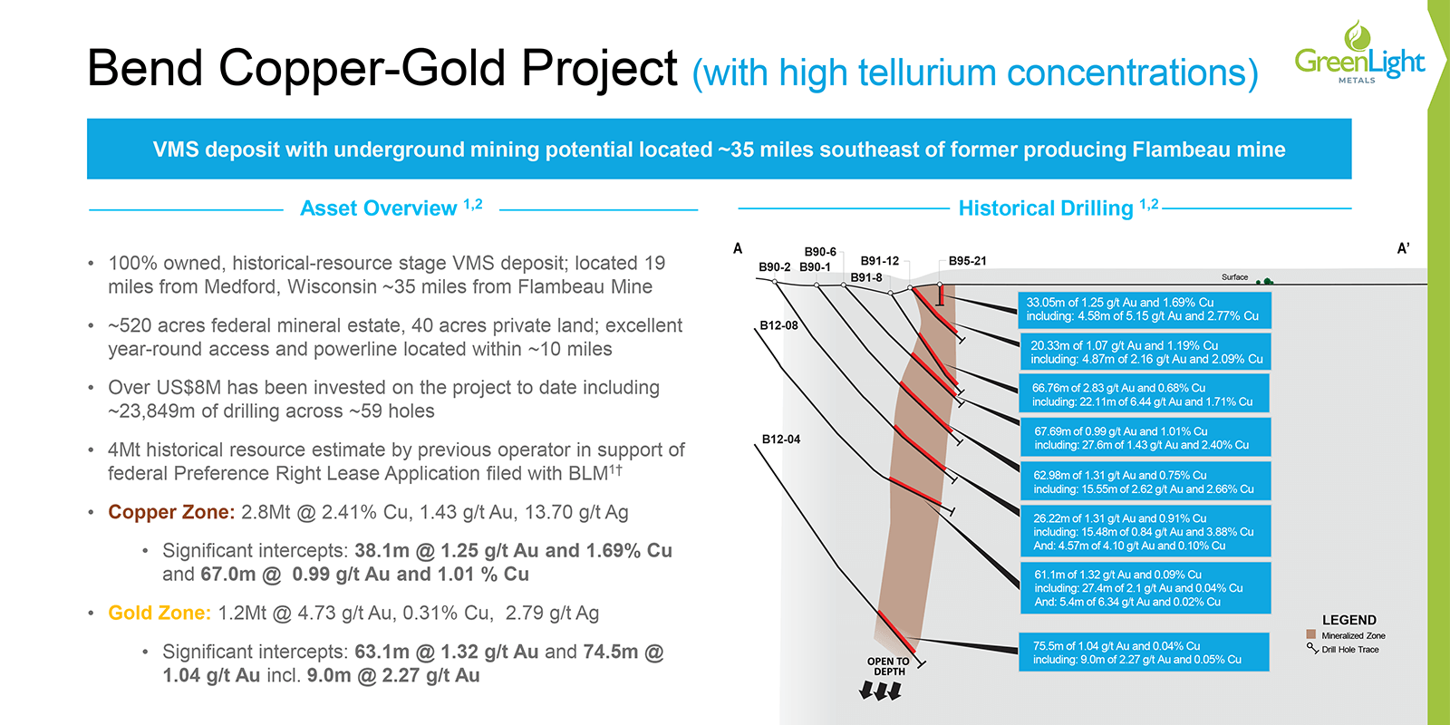 - 100%-owned copper-gold-silver VMS (Volcanogenic Massive Sulfide) system characterized by steeply dipping stacked massive and semi-massive sulfide lenses; successful Phase-1 drill program completed in 2025 by GreenLight Metals.