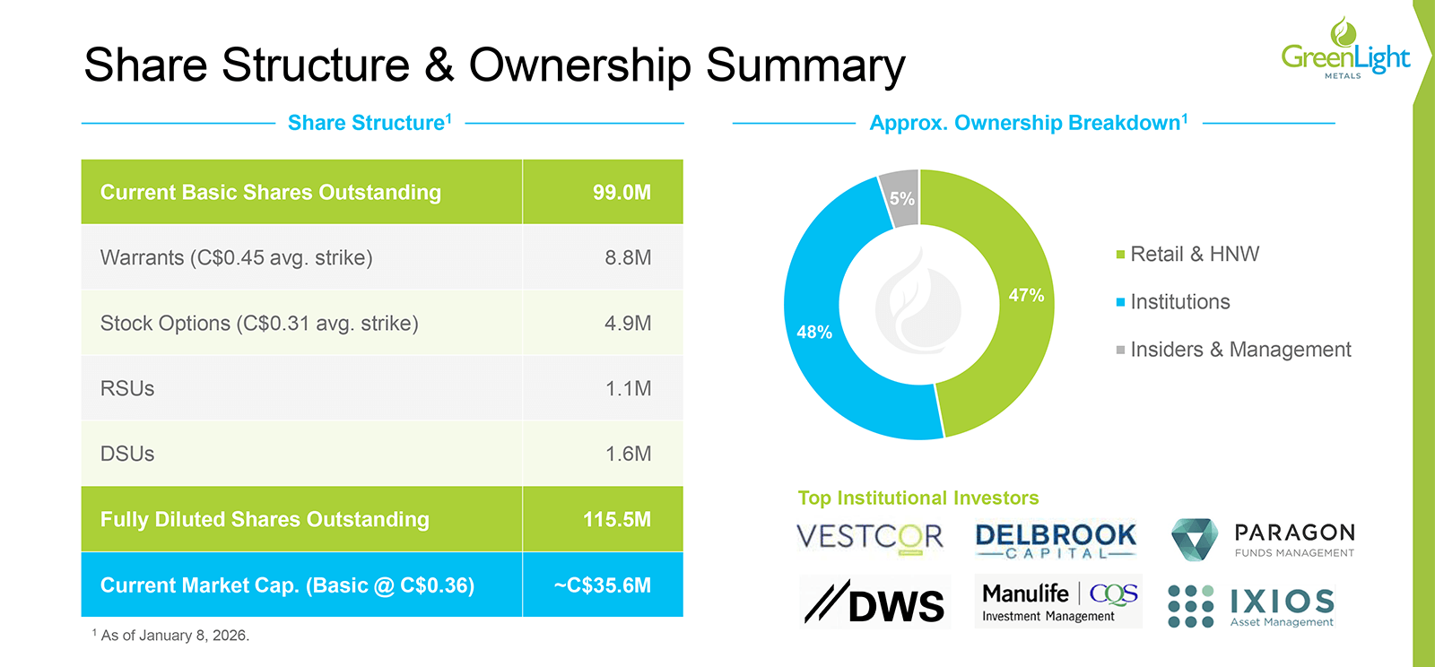 With ~100 million shares outstanding on a non-fully-diluted basis and a market capitalization below C$50 million, GRL maintains a tight share structure, providing meaningful leverage to exploration success as the project portfolio advances through successive exploration and drilling phases.