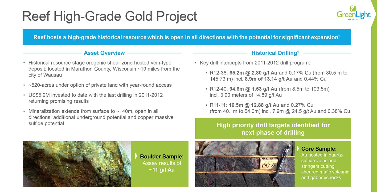 The 100%-owned Reef project represents a compelling advanced-stage gold-copper exploration opportunity within GreenLight’s copper-dominant Wisconsin portfolio.