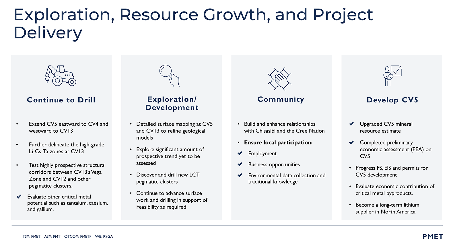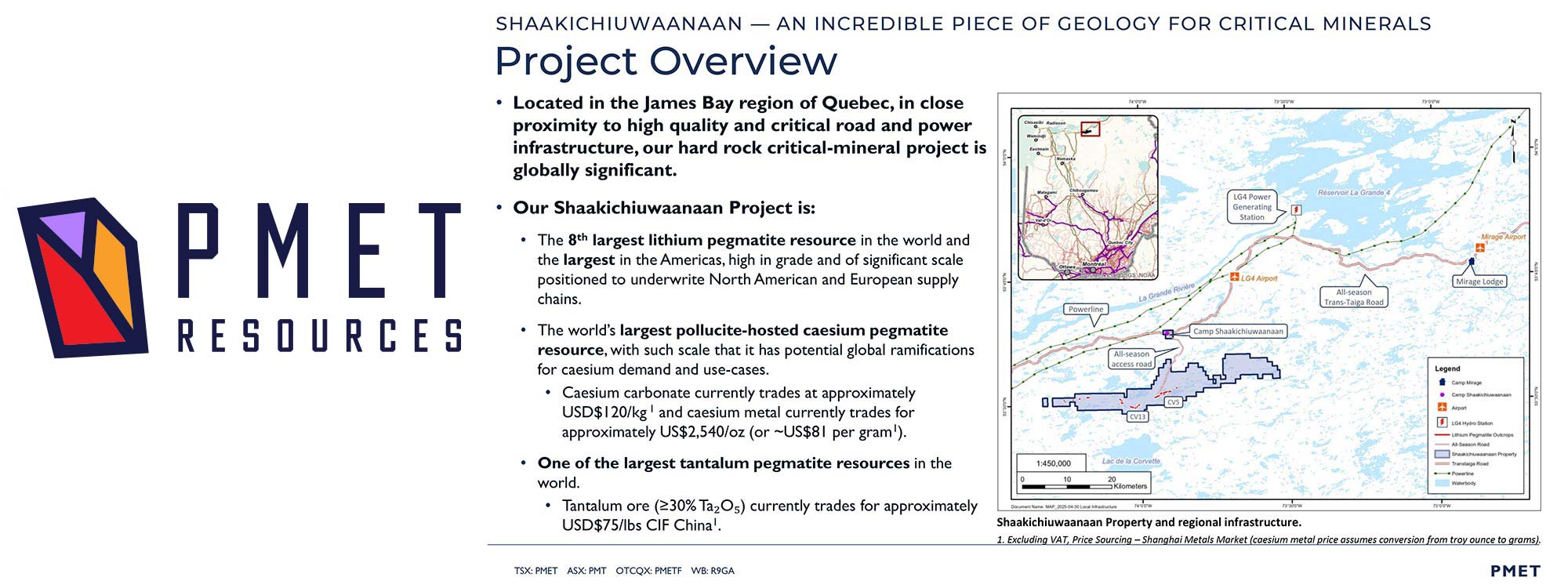 PMET Resources Inc. trades on the TSX under the symbol PMET, on the US OTCQX under the symbol PMETF, and on the ASX under the symbol PMT.