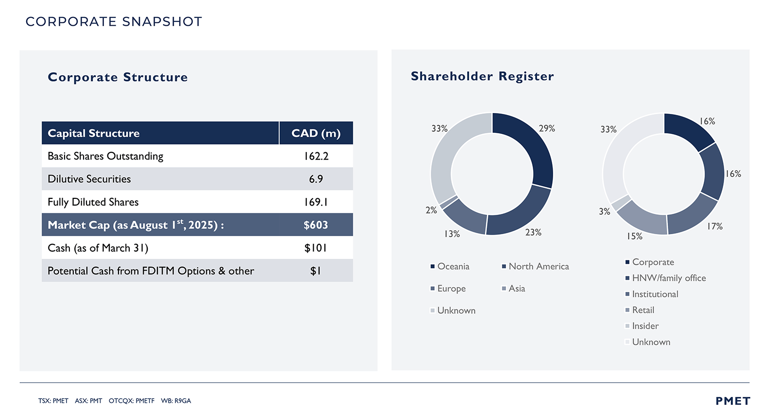 Financially and structurally, PMET is exceptionally well positioned with over C$100M in the treasury, a tight share structure, and listings across North America and Australia. The company’s share structure and capital exposure are summarized below.