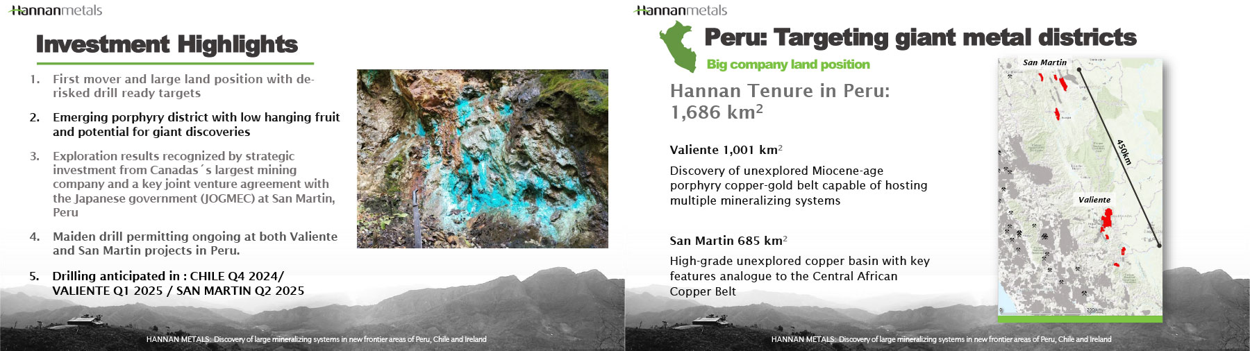 As one of the largest mineral explorers by area in Peru — at a staggering 2,154 sq km — Hannan Metals Ltd. (“HAN”) presents a true first-mover advantage in Peru’s underexplored foreland mineral basin region by way of two co-flagship properties: Valiente and San Martin.