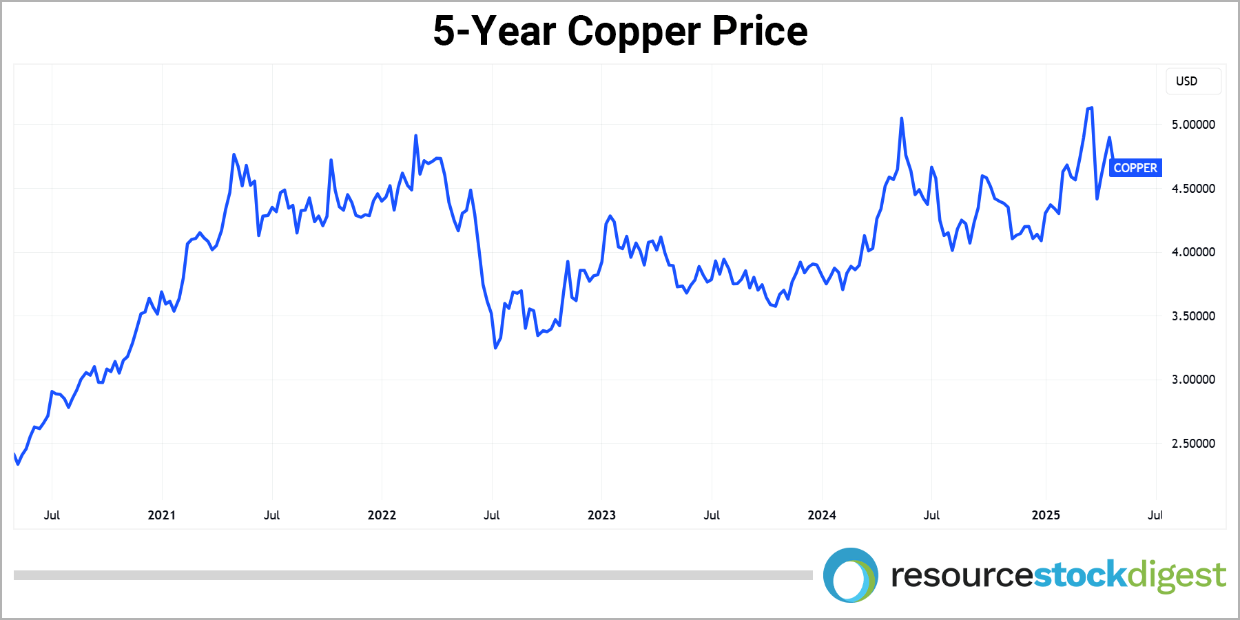 In viewing the 5-year copper price chart below, one can see that the overall price trend of the red metal has been bullish, albeit a bit choppy, since early 2020 when copper was languishing just above the US$2/lb mark. Today, as we head toward the second half of 2025, copper is trading more than 2X higher — firmly above the key US$4/lb mark.