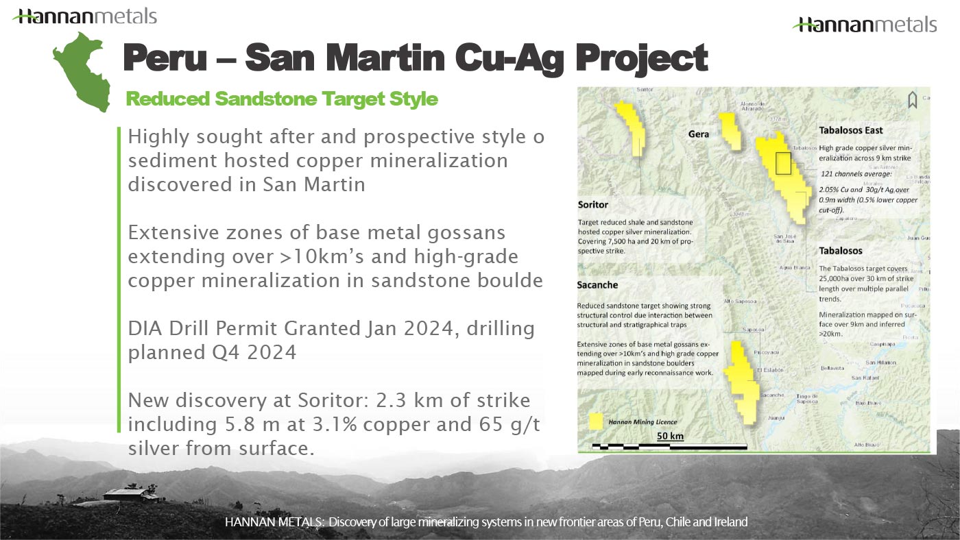 Canada-based Hannan Metals Ltd. (TSX-V: HAN)(OTC: HANNF) is a Peruvian-focused mineral exploration firm focused on the advancement of two basin-scale copper-gold-silver projects in Peru’s mineral-rich, yet vastly underexplored central eastern mining belt: Valiente and San Martin.