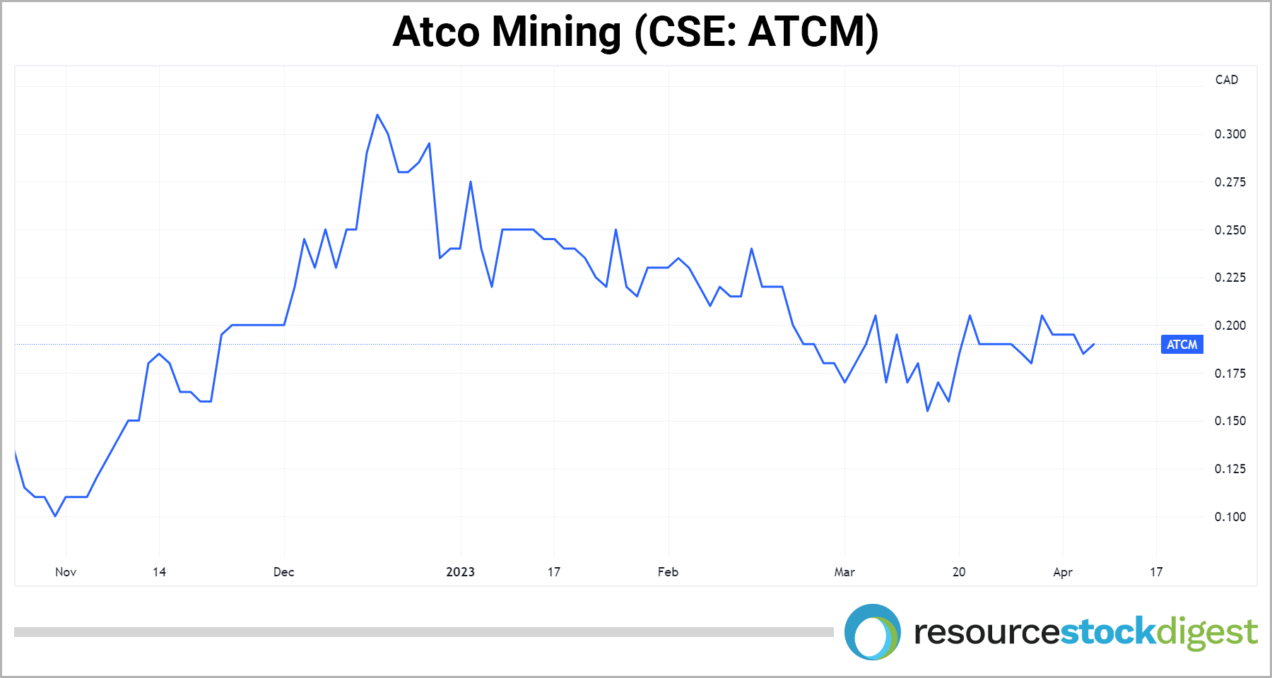 Atco Mining Inc. trades on the Canadian Securities Exchange under the symbol ATCM and on the US OTC Bulletin Board Exchange under the symbol ATMGF.