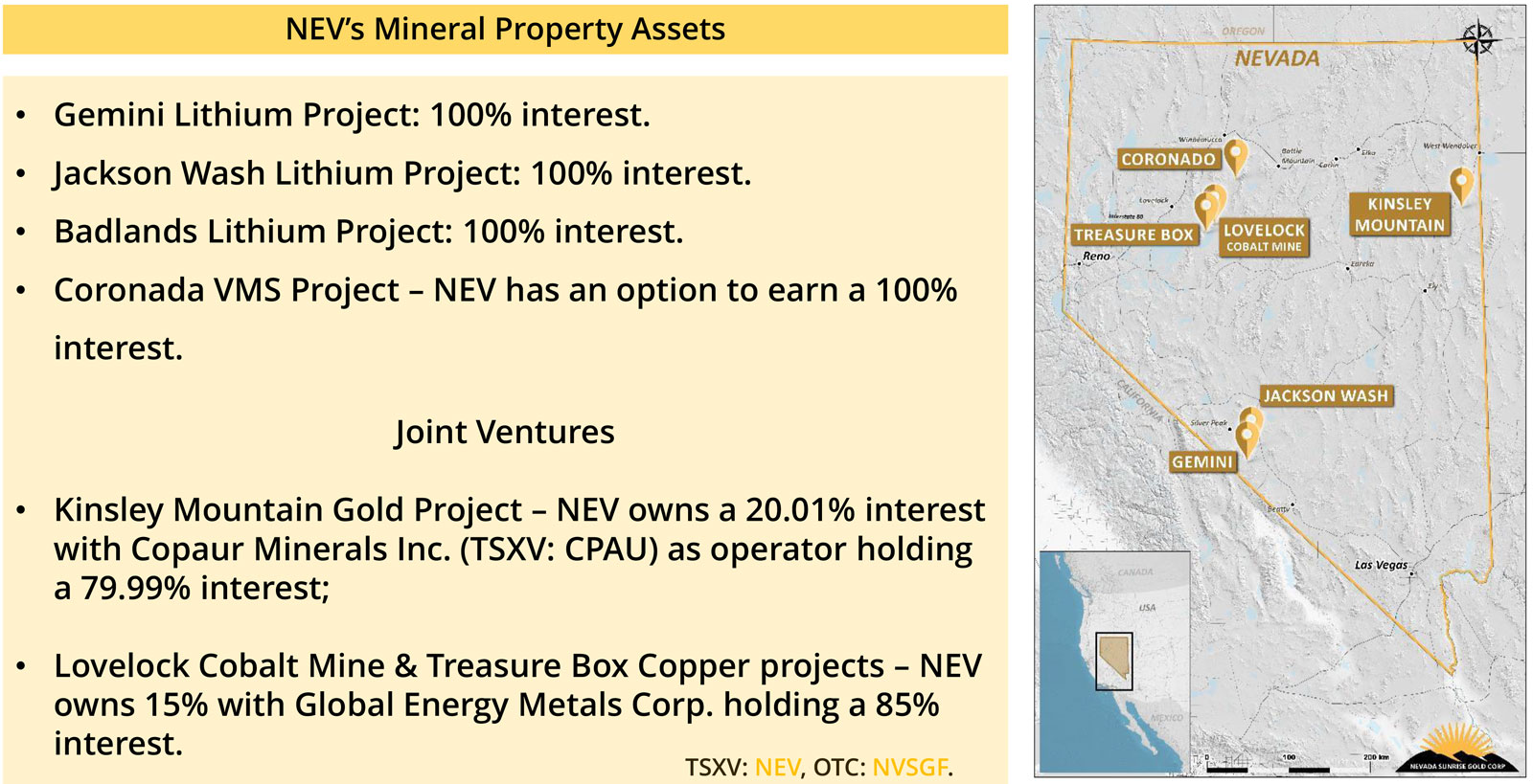 With a focus on green-energy metals such as lithium, cobalt, and copper, as well as safe-haven commodities such as gold — Nevada Sunrise is well-positioned to advance multiple properties of merit in a rising commodities market to the benefit of NEV/NVSGF shareholders.