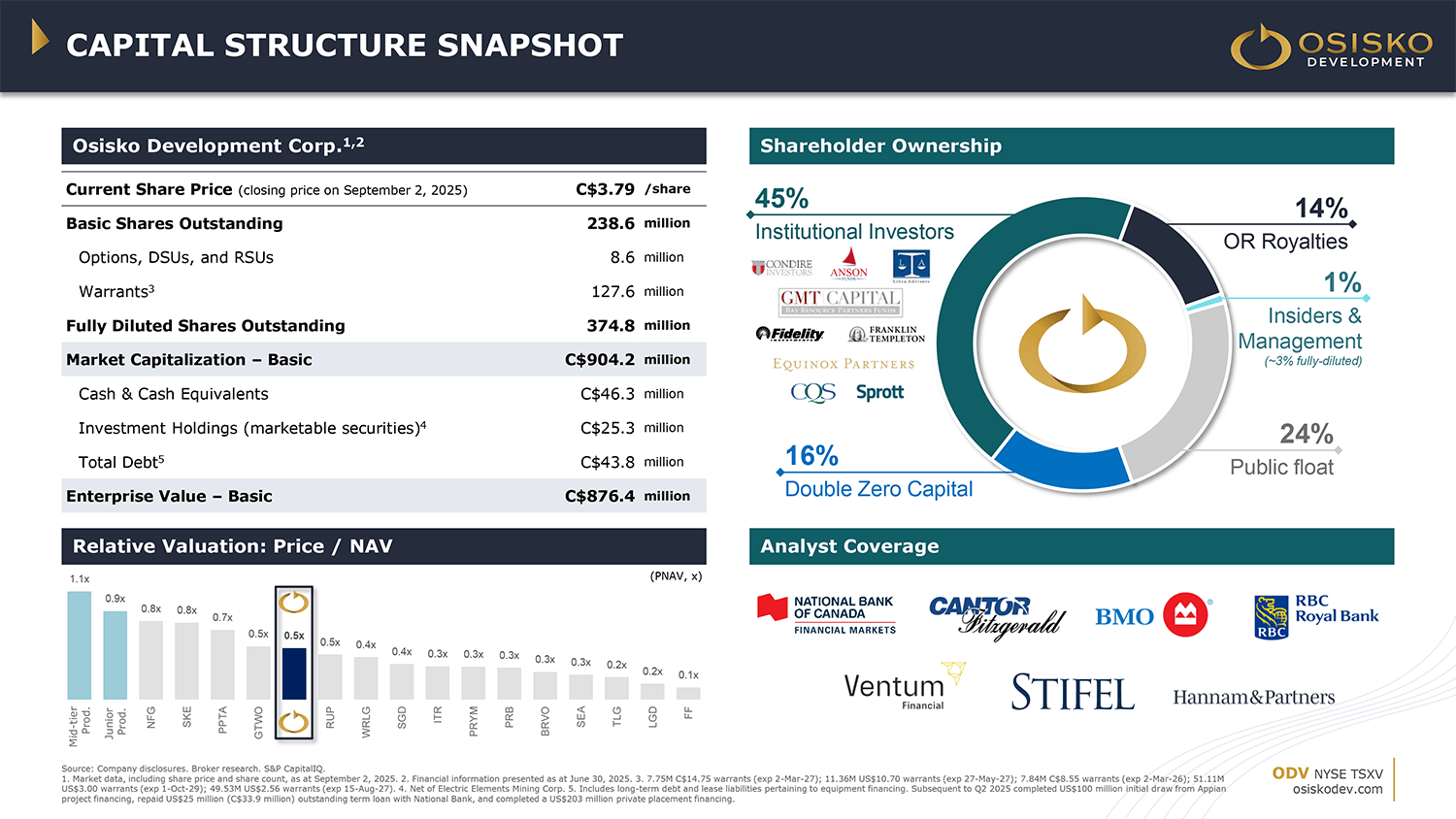Financially, Osisko is exceptionally well-positioned. As of 31 March 2025, the company held approximately C$77.6 million in cash and cash equivalents. ODV is also very well-structured with ~223 million shares outstanding on a fully-diluted basis.