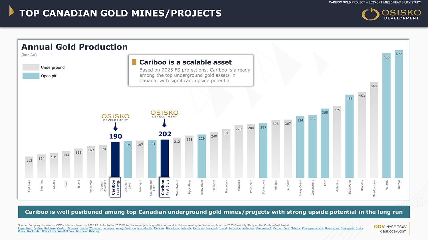 In April 2025, ODV delivered an updated NI 43‑101 compliant Feasibility Study outlining a robust underground operation with expected average annual production of 190,000 ounces Au over a 10-year mine life — totaling 1.89 million payable ounces.