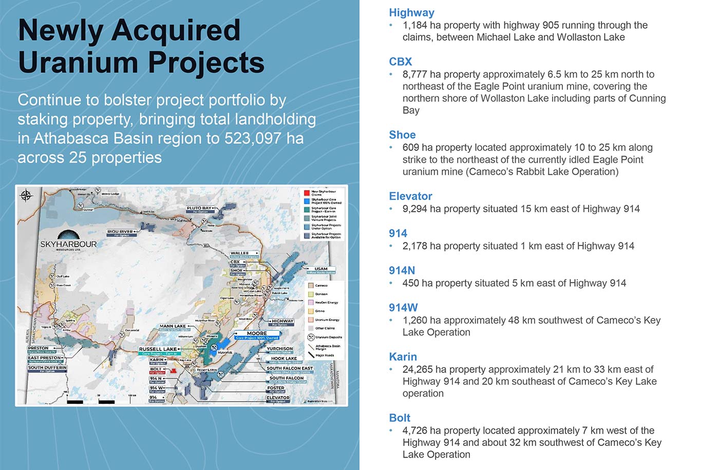 As noted, Skyharbour will also be actively seeking project partners for the nine early-stage uranium assets recently acquired, along with the other remaining 100% projects in and around the Athabasca Basin.