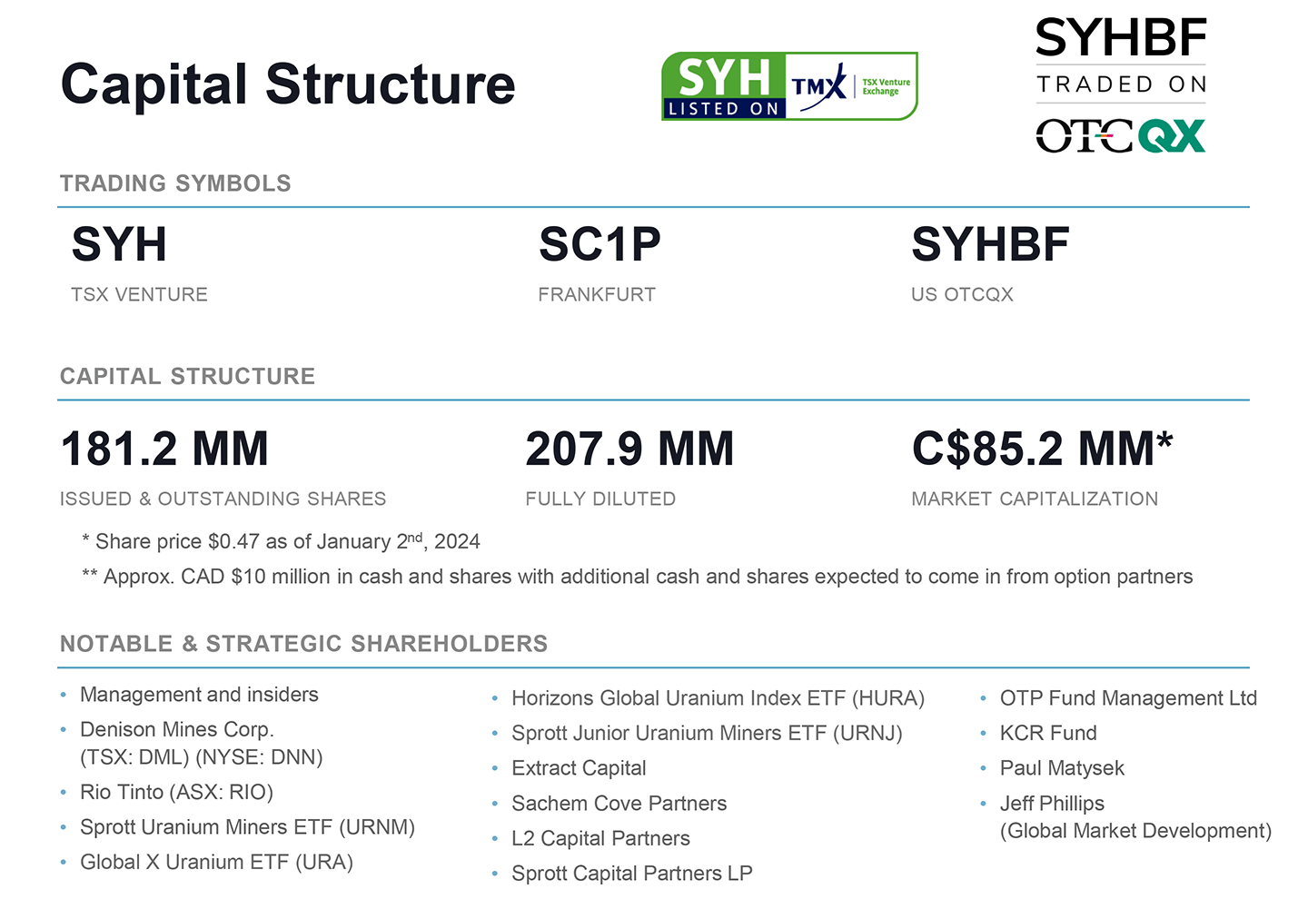 The flagship projects are the 100%-owned Moore Lake Uranium Project located 15 km east of Denison’s Wheeler River uranium project and 39 km south of Cameco’s McArthur River uranium mine as well as the adjacent Russell Lake Project being optioned from Rio Tinto. Additionally, SYH has a total of 8 partner-funded uranium projects in the Athabasca Basin region as part of their prospect generator strategy.