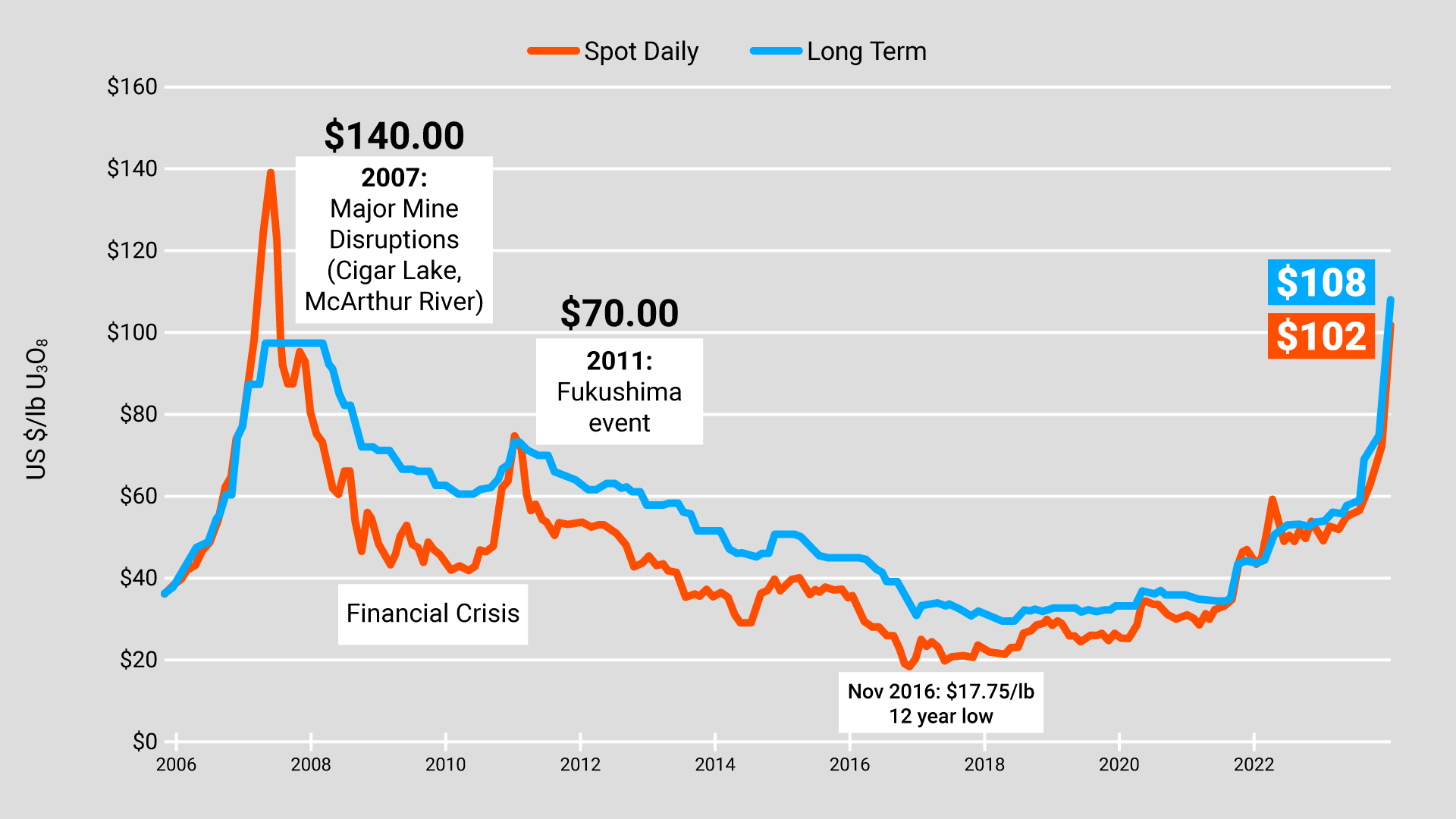 After an extended consolidation in the space, the uranium spot price is now riding decade-plus highs above US$100/lb with plenty of runway ahead.