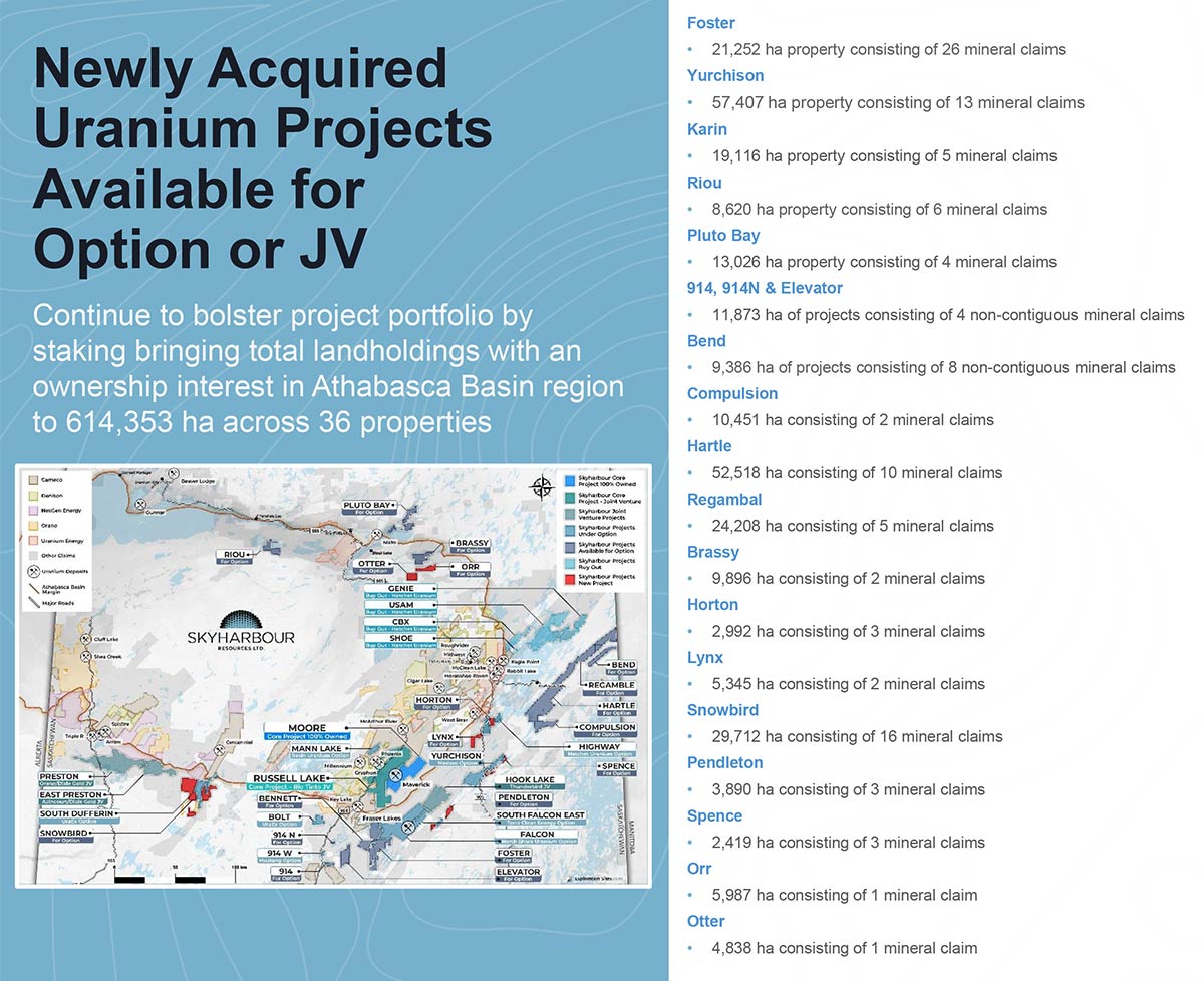 The combination of 100%-owned and partner-funded projects (currently, eleven partner-funded projects being actively advanced by ten partner companies) makes Skyharbour one to watch in the newly-resurgent uranium bull market.